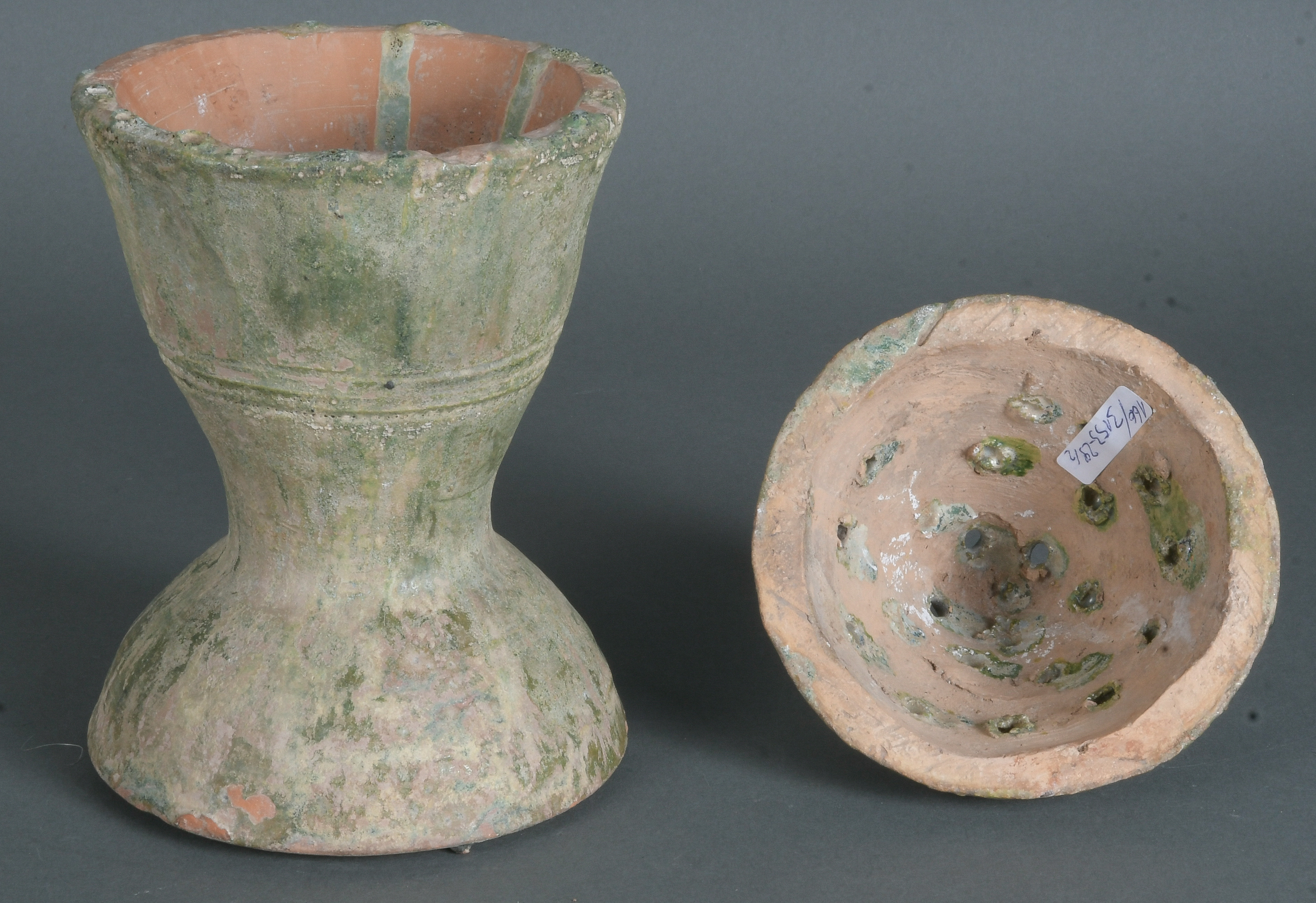 - Katalog-Nr: 31Weihrauchgefäß. China, Han-Dynastie 206 v. Chr. - 220 n. Chr. Keramik / Terrakotta, mit grüner transparenter Glasur: Sog. Boshan-Typ, der durchbrochene Deckel bildet eine stilisierte Berglandschaft nach, das Unterteil in Form eines Fußbechers, H=22,5 cm. Provenienz: Galerie Eskenazi, London 1997; Sammlung Prof. Dr. Peer Hultberg (1935-2007), Hamburg.o.L.