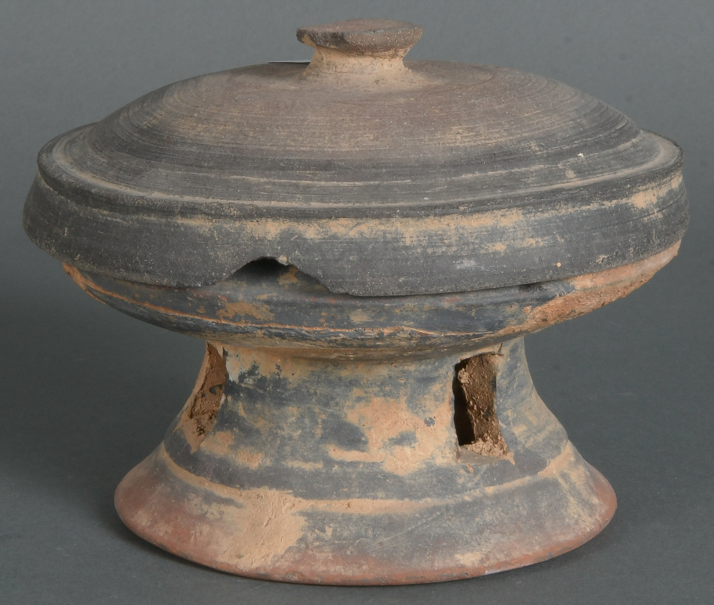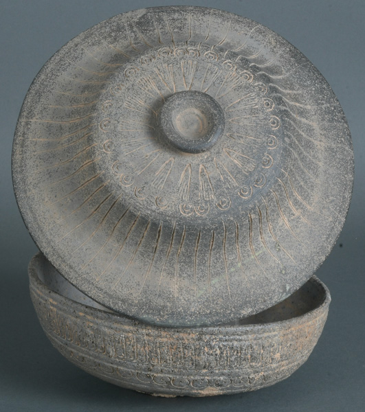 - Katalog-Nr: 30Deckeldose. Korea, Silla-Reich 57 v. Chr. - 668 n. Chr. Steinzeug, schwarz gebrannt, mit eingeritzten und gestempelten Ornamenten dekoriert. Flach gemuldete Schale auf Strandring, Deckel in Form eines Daches mit Ringknauf. Beide Teile mit alter Sammlungsnummer, Schalenunterseite mit Sedimentanhaftungen, H=12,5 cm, D=18 cm (Deckel rest.). Provenienz: Sammlung Prof. Dr. Peer Hultberg (1935-2007), Hamburg. Vgl.: W.B. Honey „Corean Pottery“, London o.J., Taf. 2.o.L.