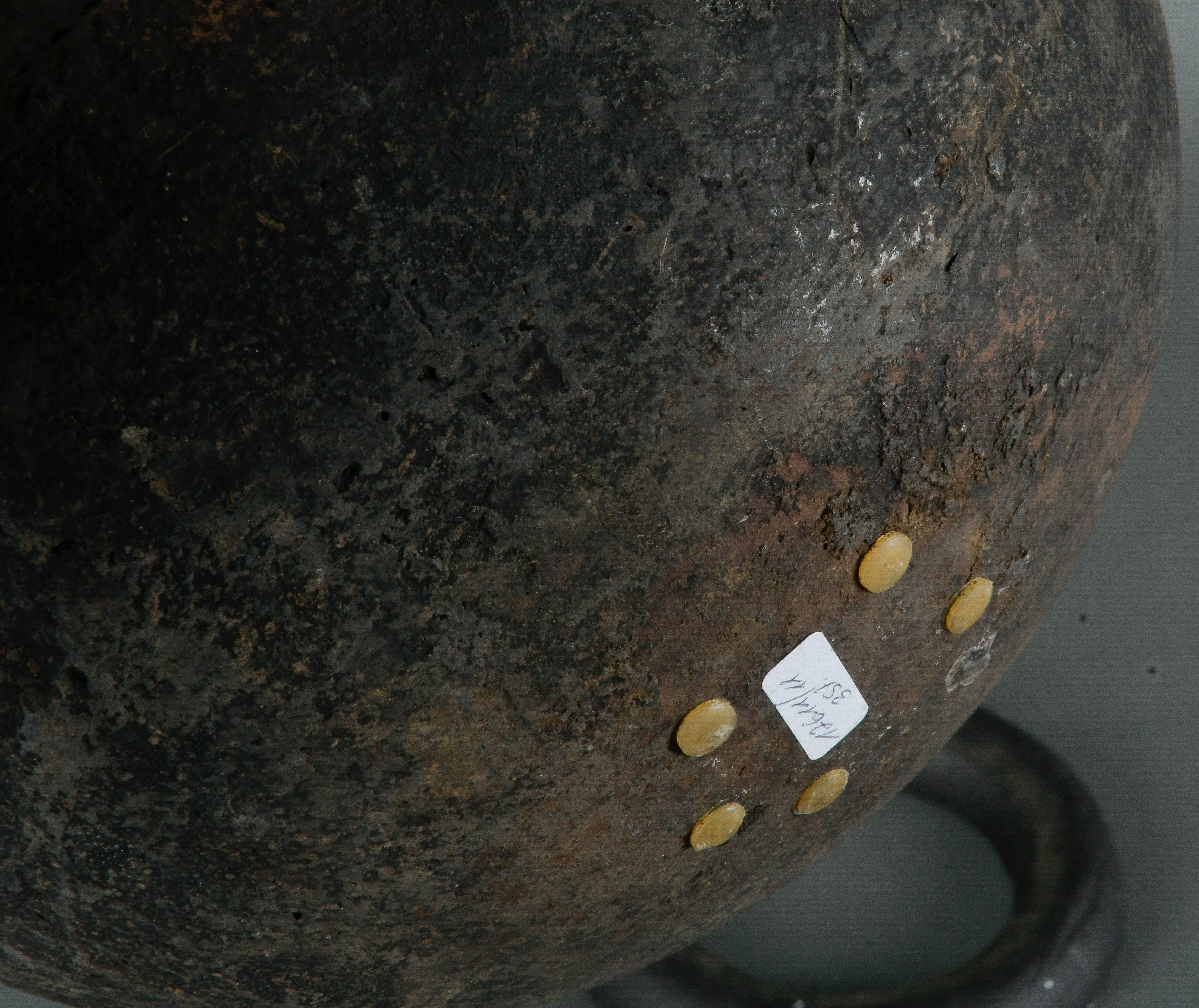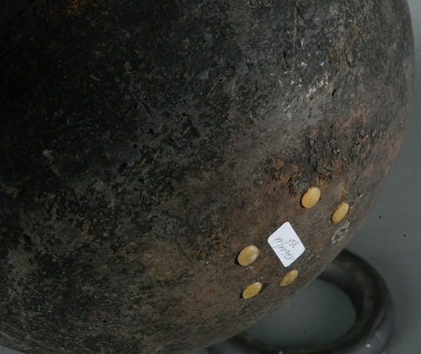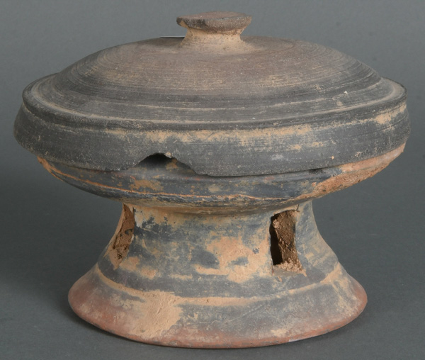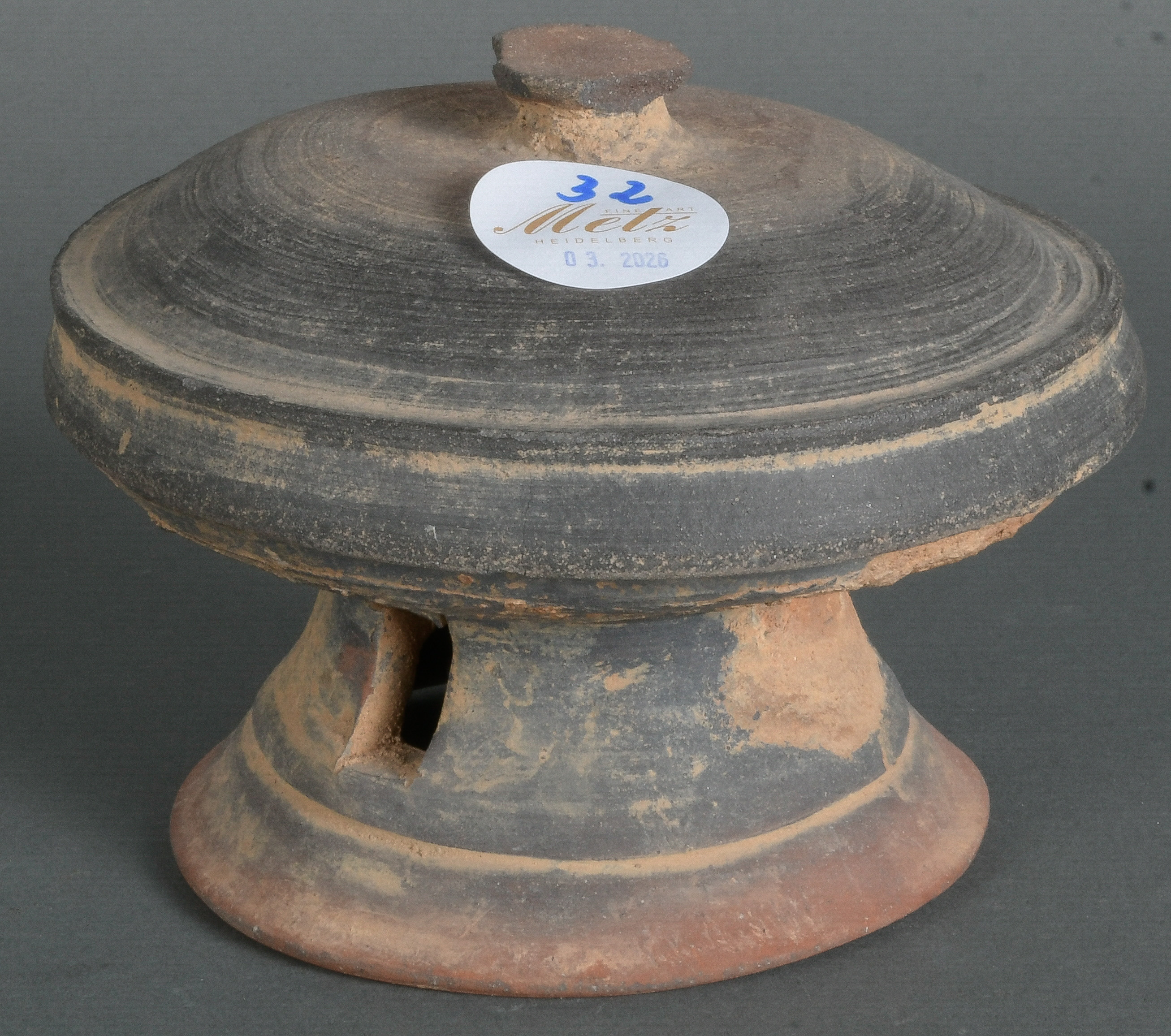 - Katalog-Nr: 32Deckelschale. Korea, Silla-Reich 57 v. Chr. - 668 n. Chr. Steinzeug, rötlicher Scherben, partiell schwarz gebrannt. Flach gemuldelte Schale mit nicht passgenauem Deckel, auf konkavem Standfuß, H=10 cm, D=13,5 cm. Provenienz: Sammlung Prof. Dr. Peer Hultberg (1935-2007), Hamburg. (Deckel ergänzt, am Knauf und Rand best., Sedimentanhaftungen)o.L.