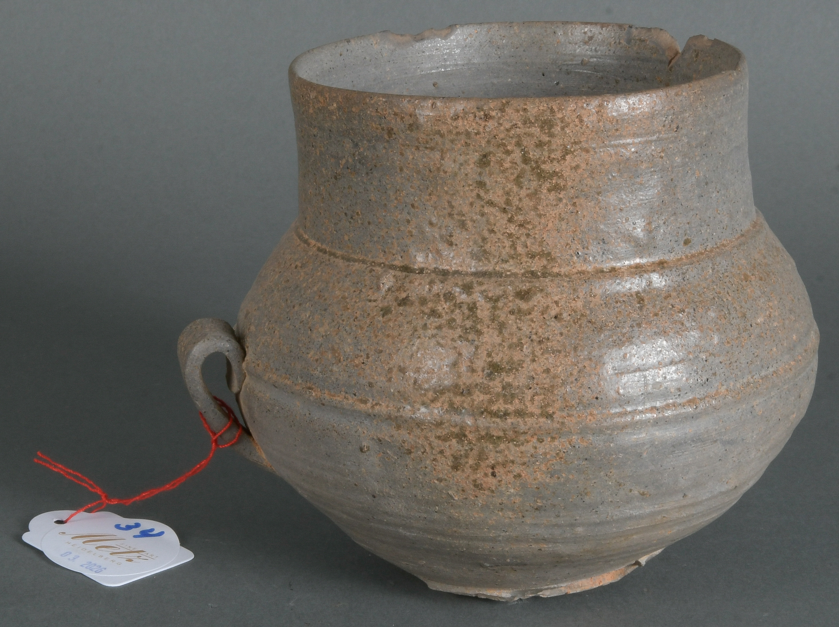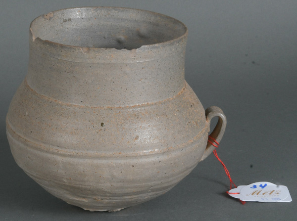 - Katalog-Nr: 34Vorratsgefäß. Korea, Silla-Reich 57 v. Chr. - 668 n. Chr. Steinzeug, grauer Scherben, glasiert. Bauchig, mit kleinem anmodellierten Schlaufenhenkel und kurzem zylindrischen Hals, H=11 cm. Provenienz: Sammlung Prof. Dr. Peer Hultberg (1935-2007), Hamburg. (Rand alt best.)o.L.