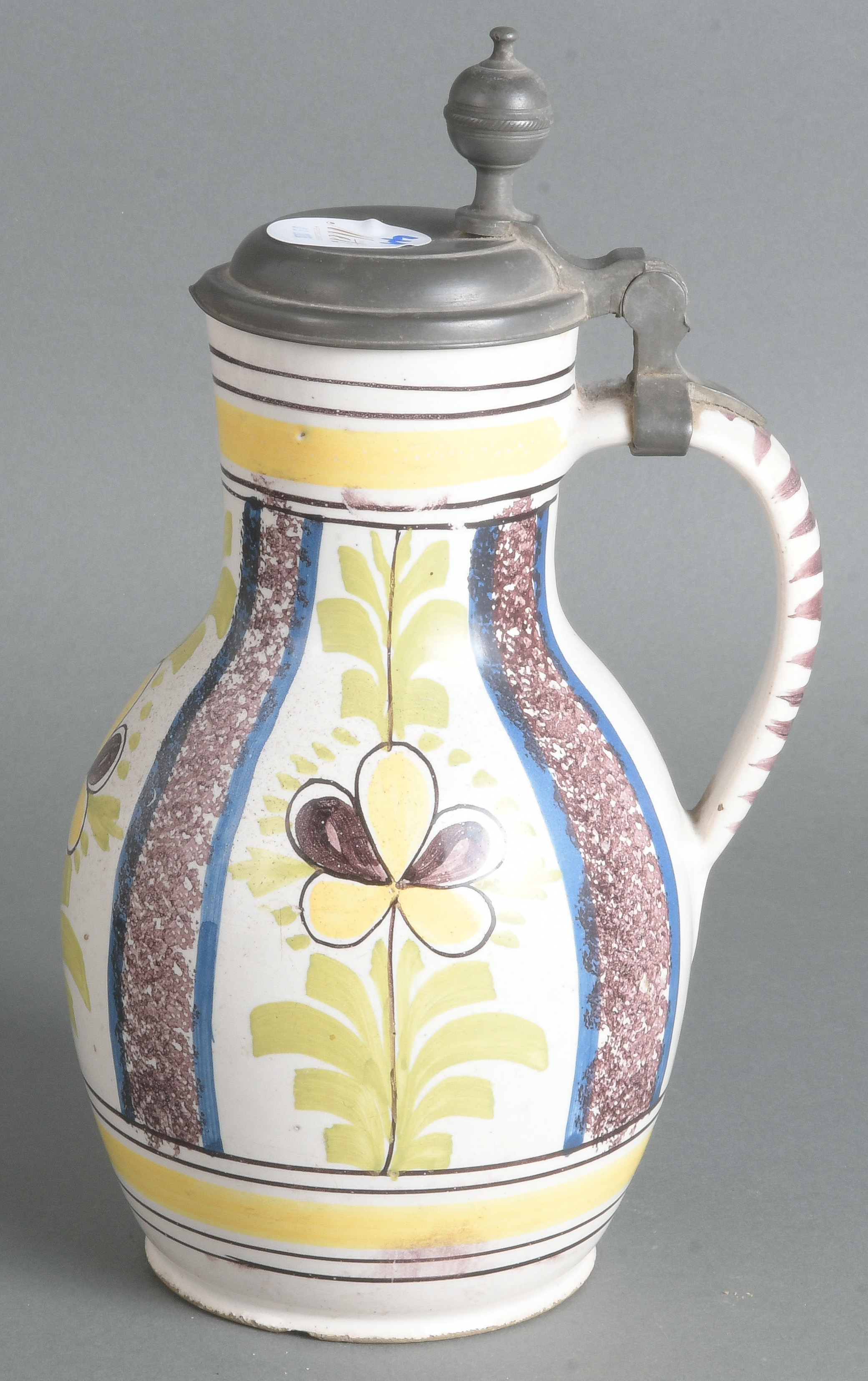 - Katalog-Nr: 41Birnkrug. Crailsheim 18. Jh. Fayence, bunt bemalt, mit Zinnmontur und -deckel, ohne Marke, H=19 / 23,9 cm. (min. best.)o.L.