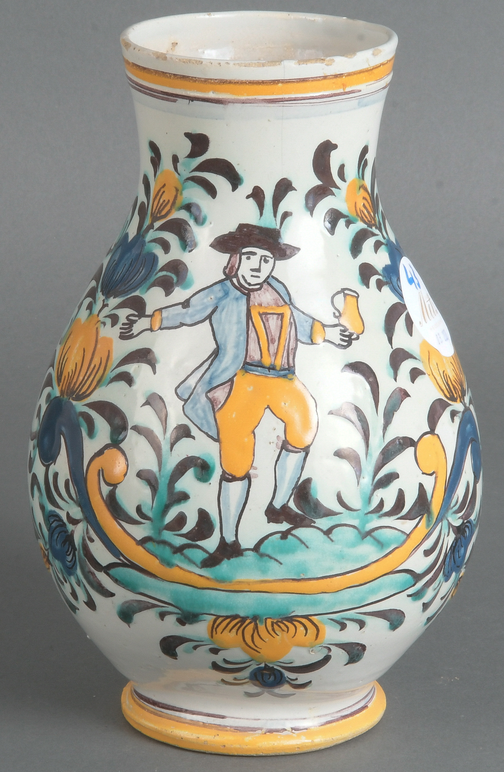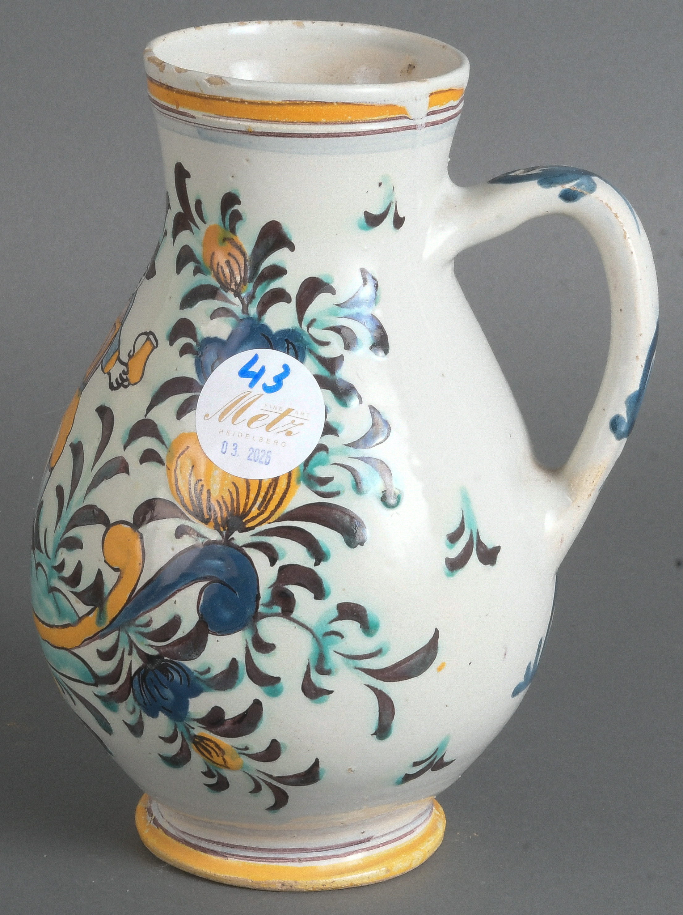 - Katalog-Nr: 43Birnkrug. Gmunden um 1800. Fayence, bunt bemalt mit Floraldekor und Personenstaffage, H=19,5 cm. (best.)o.L.