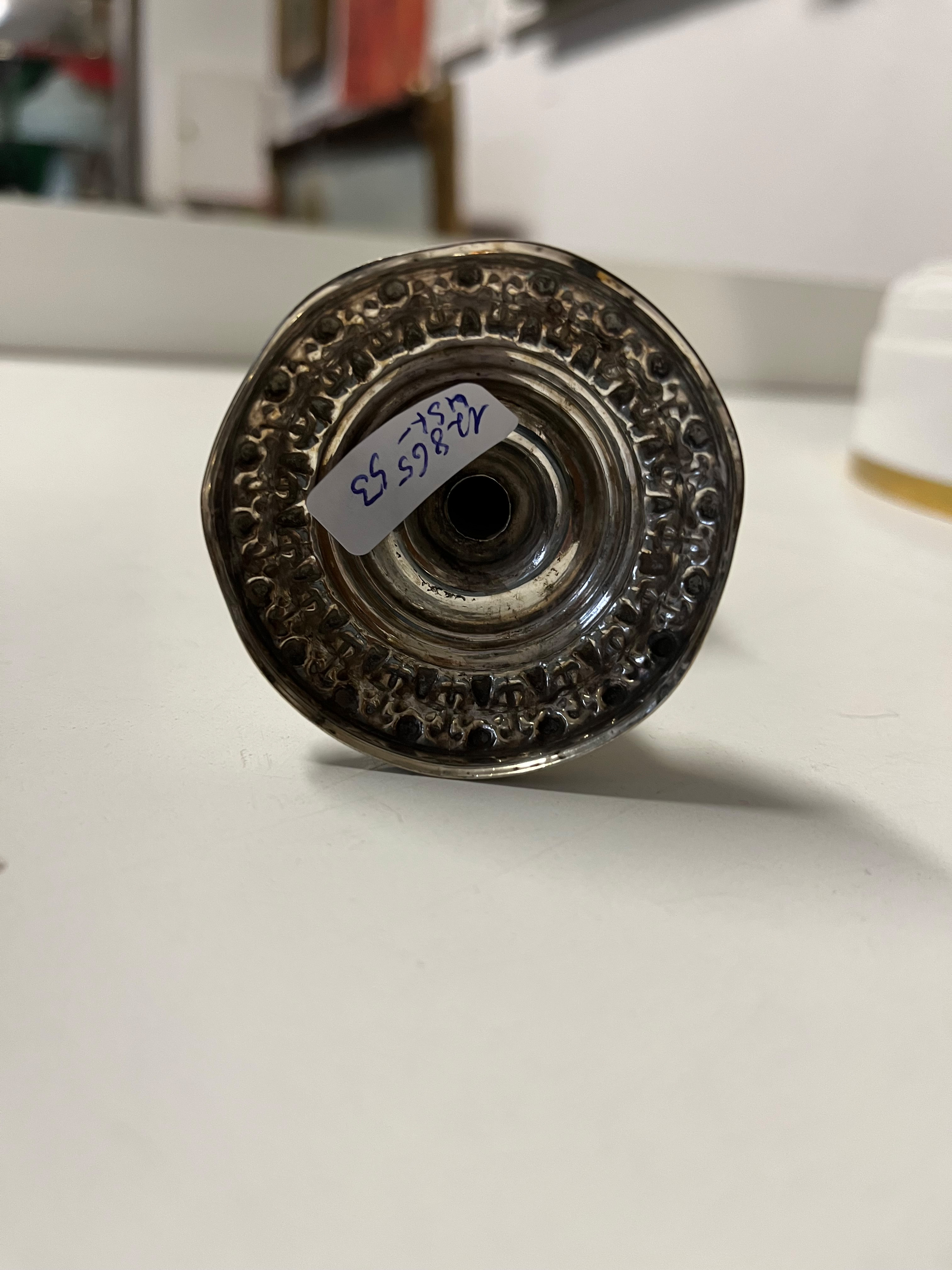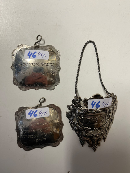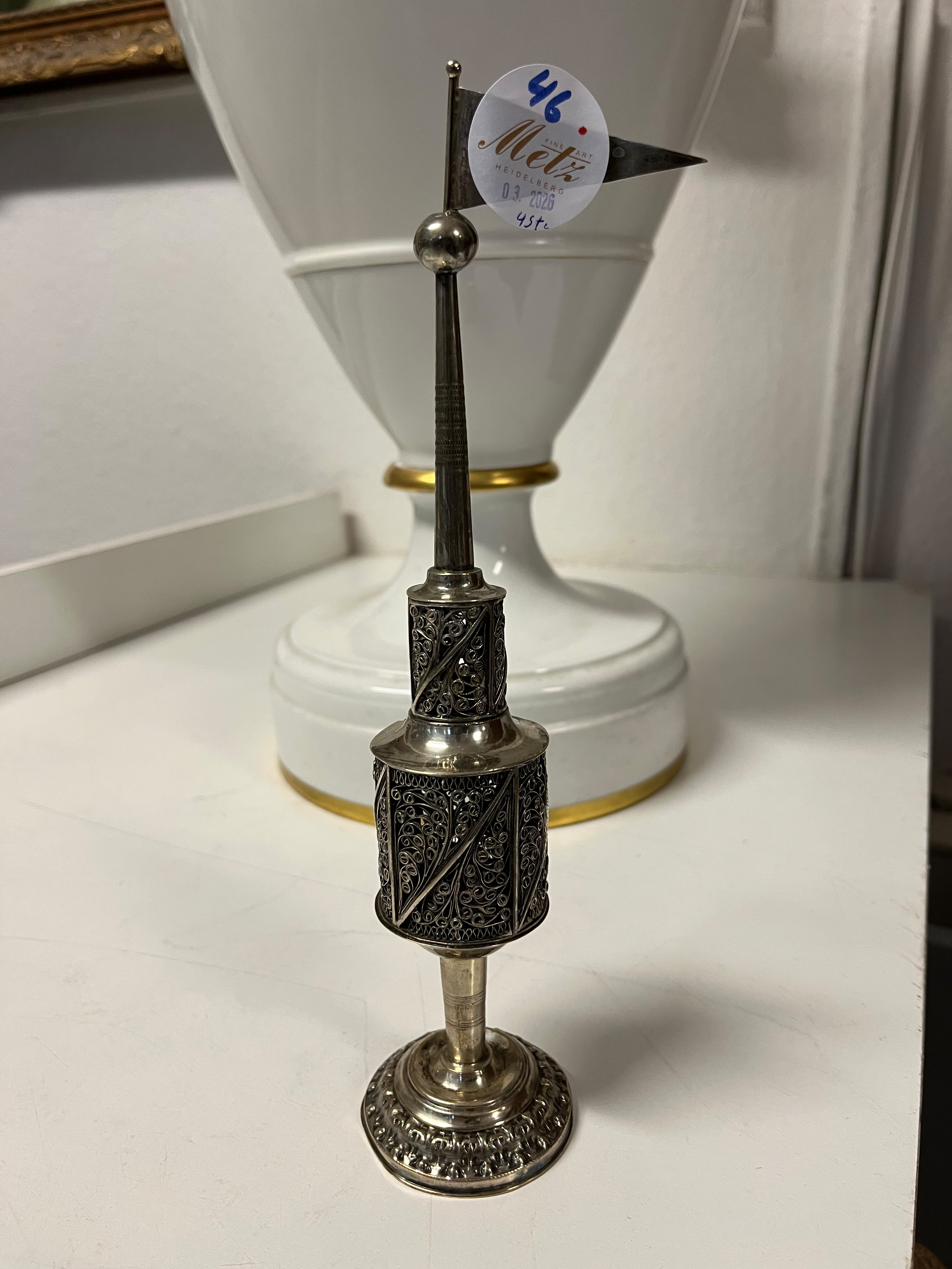 - Katalog-Nr: 46Viertlgs. Konvolut Judaica. Wohl deutsch 20. Jh. Silber, ca. 168 g, bestehend aus: Besamim-Turm (H=25,5 cm) und drei unterschiedlich beschriftete Schilder (5 x 5,5 / 7,5 x 6 cm)o.L.