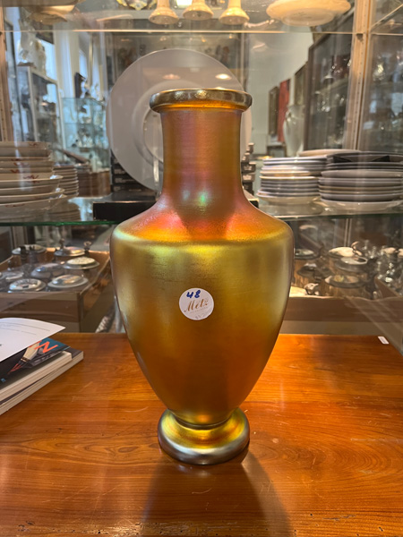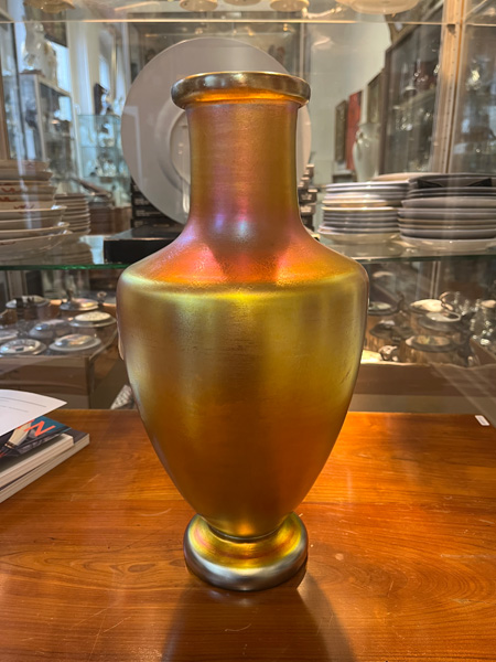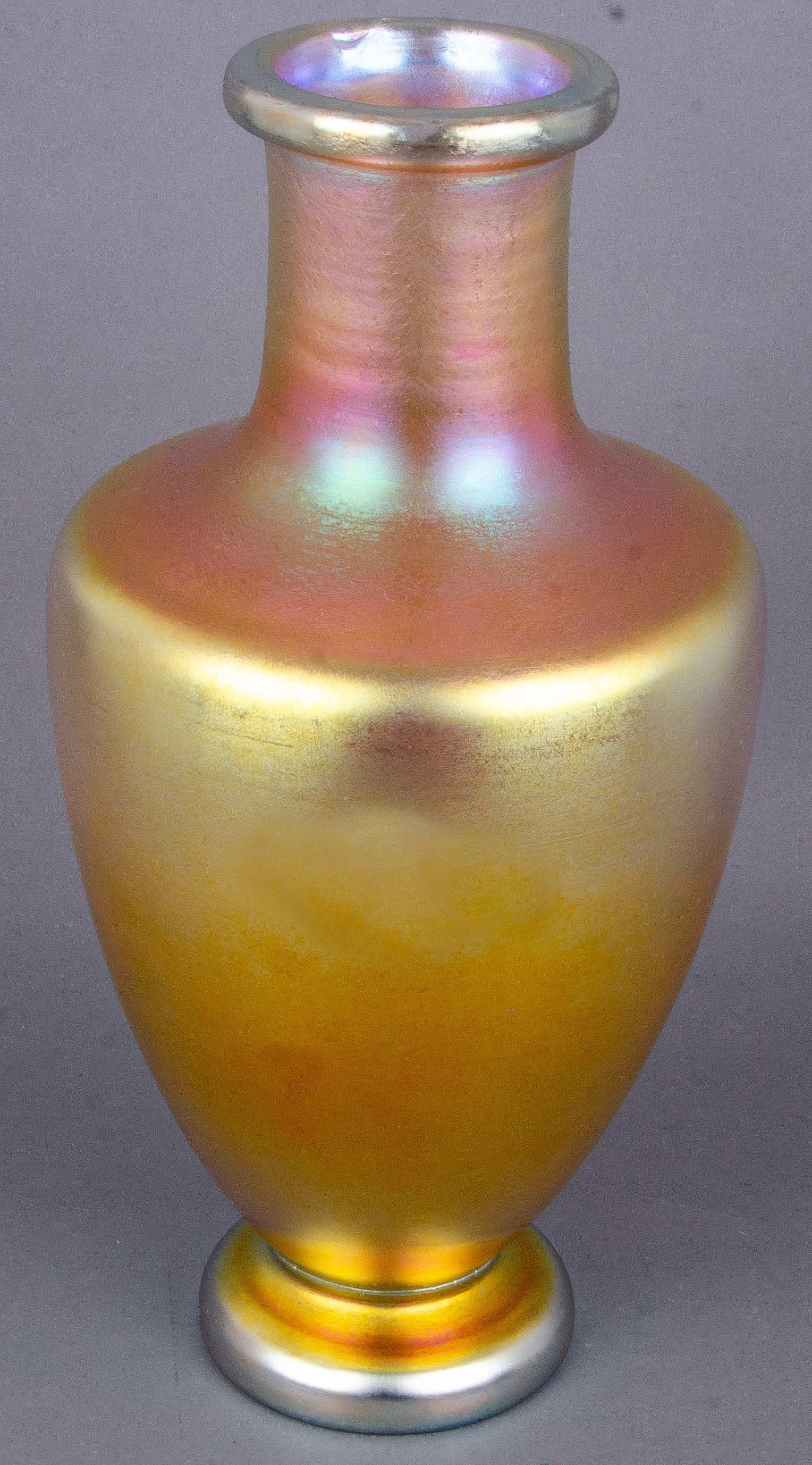 - Katalog-Nr: 48Hohe Jugendstil-Vase. New York, Louis Comfort Tiffany um 1900. Farbloses Glas, lachsfarben lüstrierend überfangen; am Boden Ätzsignatur und Nr. „36042“, H=39 cm.o.L.
