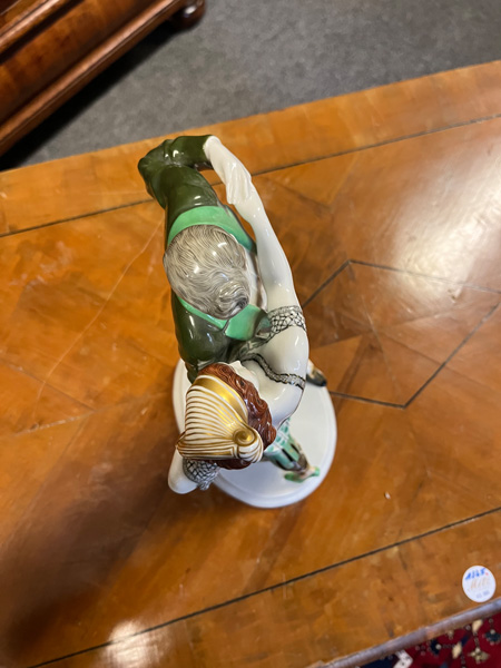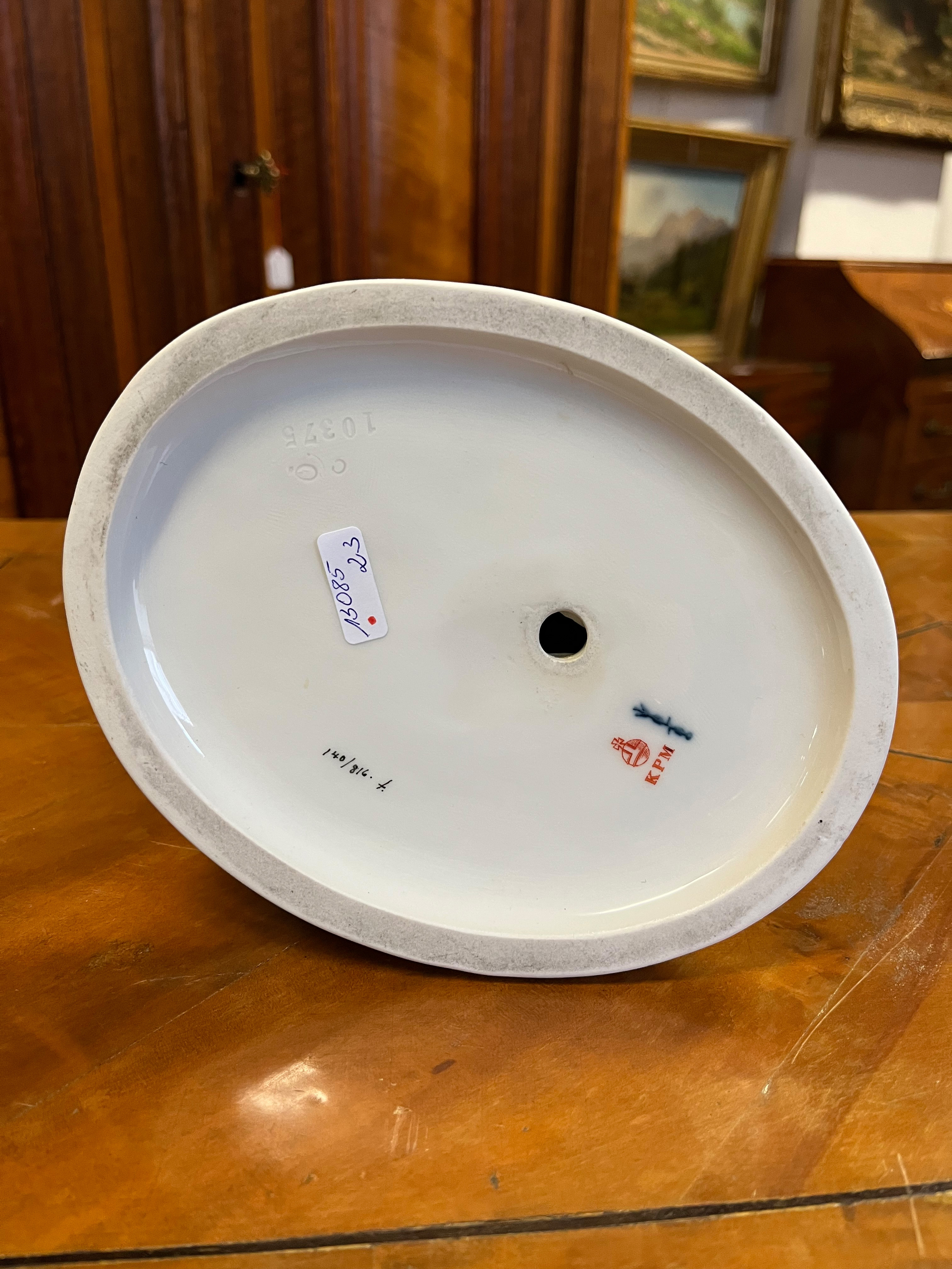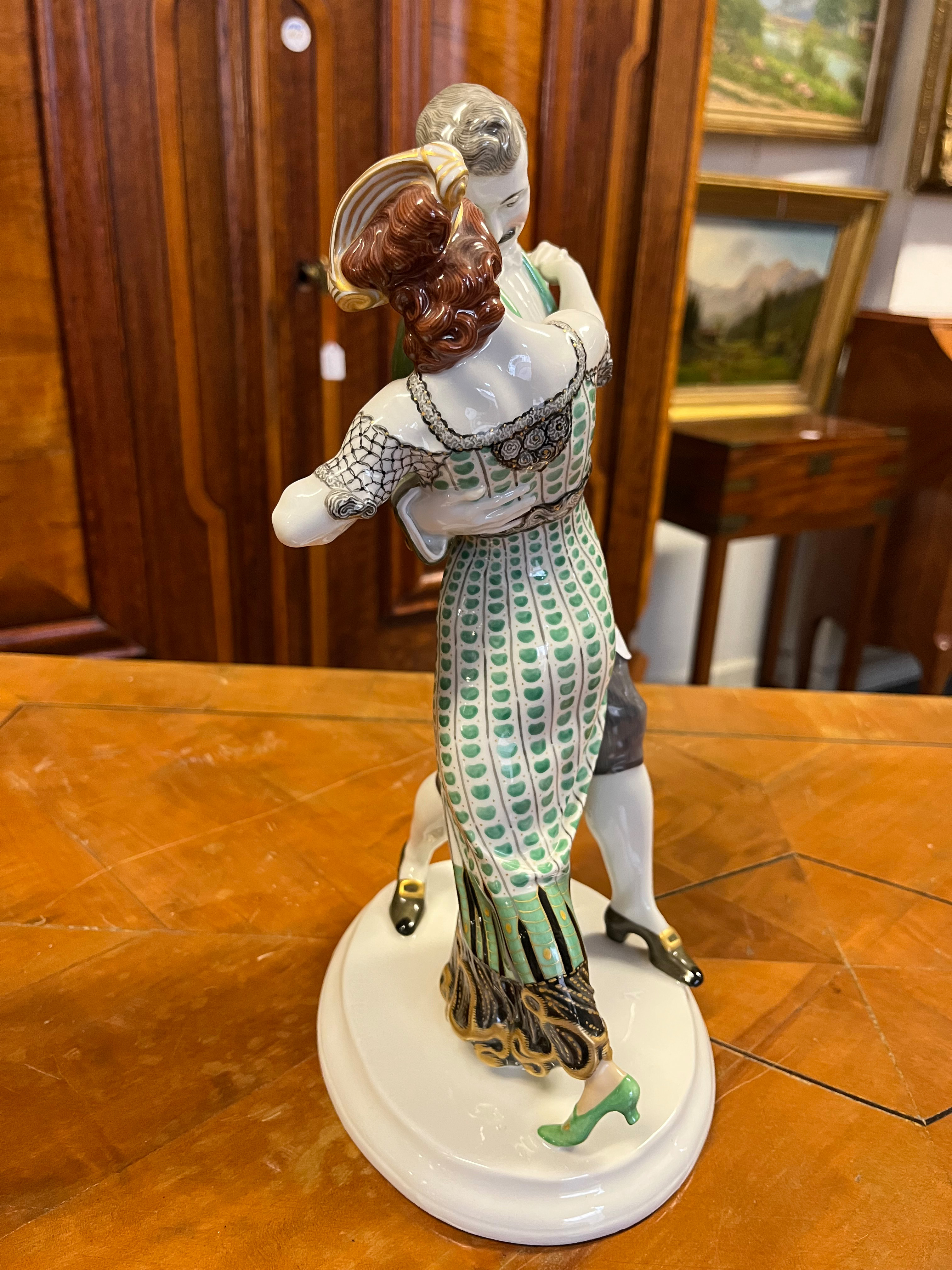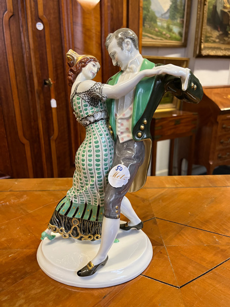 - Katalog-Nr: 50Tänzerpaar. Berlin 1915. Je stehend auf ovalem, profiliertem Sockel. Porzellan, bunt bemalt, am Boden unterglasurblaue Szeptermarke mit korallenrotem „KPM“ und Reichsapfel, Formnummer „10375“ mit Jahresbuchstabe, Staffiererziffer „140/816.f“, Entwurf und sign. Ferd.(inand) Liebermann, H=32 cm.o.L.