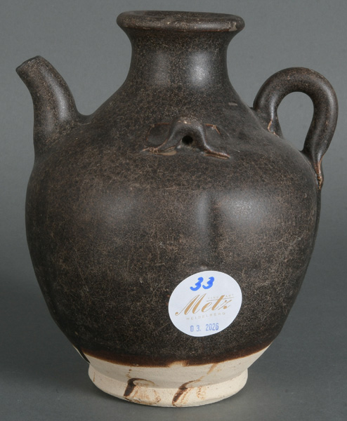 - Katalog-Nr: 33Kleine Kanne. China Fünf Dynastien / Song-Dynastie. Sehr heller Steinzeugscherben, mit dunkelbrauner, stark deckender Glasur. Bauchige Form, kurzes geschwungenes Ausgussrohr, zwei anmodellierte Schlaufen auf der Gefäßschulter, anmodellierter Henkel, H=16 cm. Provenienz: Sammlung Prof. Dr. Peer Hultberg (1935-2007), Hamburg. (am Ausgussrand min. retuschiert, min. gechippt am Rand)o.L.