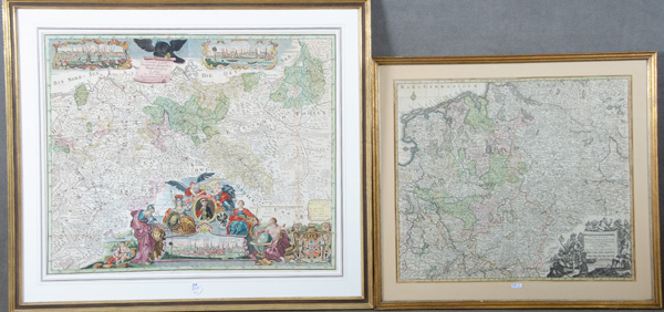 - Katalog-Nr: 37Johann David Schleuen (Graphiker des 18. Jhs.). Generalkarte der gesamten königlich-preussischen Länder. Farbiger Kupferstich mit Wappenkartusche, mittig/o./sign. (58,5 x 79,5 cm); dazu Georg Matthäus Seutter (1678-1757). Karte von Westphalen. Colorierter Kupferstich mit Wappenkartusche, li./u./sign. (50 x 57,5 cm). Je mit Passepartout hi./Gl. gerahmt.o.L.
