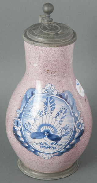 - Katalog-Nr: 42Birnkrug. Ansbach 18. Jh. Umlaufend mit manganviolett gesprenkeltem Fond. Schauseite unterglasurblau bemalt mit Floraldekor. Fayence, mit Zinnmontur und -deckel; am Boden gemarkt, mit Malermonogramm, H=23,5 / 27,5 cm. (min. best.)o.L.