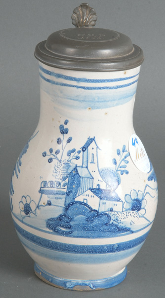 - Katalog-Nr: 44Birnkrug. Hanau 18. Jh. Fayence, unterglasurblau bemalt mit Architekturen, mit Zinnmontur und -deckel, ohne Marke, H=17,5 / 20 cm. (min. best.)o.L.