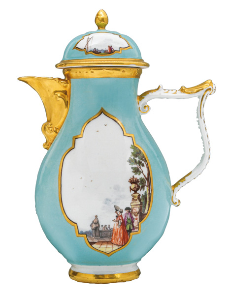 - Katalog-Nr: 47Kaffeekanne. Meissen 1730-35. Birnförmig, mit seitlich geschupptem J-Henkel und Rocailleschnaupe. Überstehender Deckel mit Pinienknauf. Seegrüner Fond, gold gesäumt. Beide Schauseiten mit spitzovalen Aussparungen. Reserven beidseitig bunt bemalt mit Kauffahrteiszenen und Figurenstaffage. Porzellan, am Boden unterglasurbalue Schwertermarke, Goldziffer „63.“. , H=22,8 cm. Vgl. R. Rückert 1966, Taf. 111, Nr. 440.o.L.