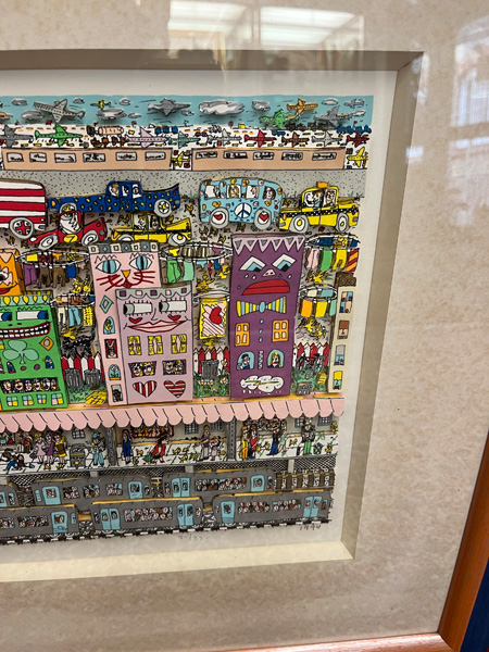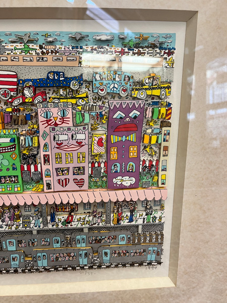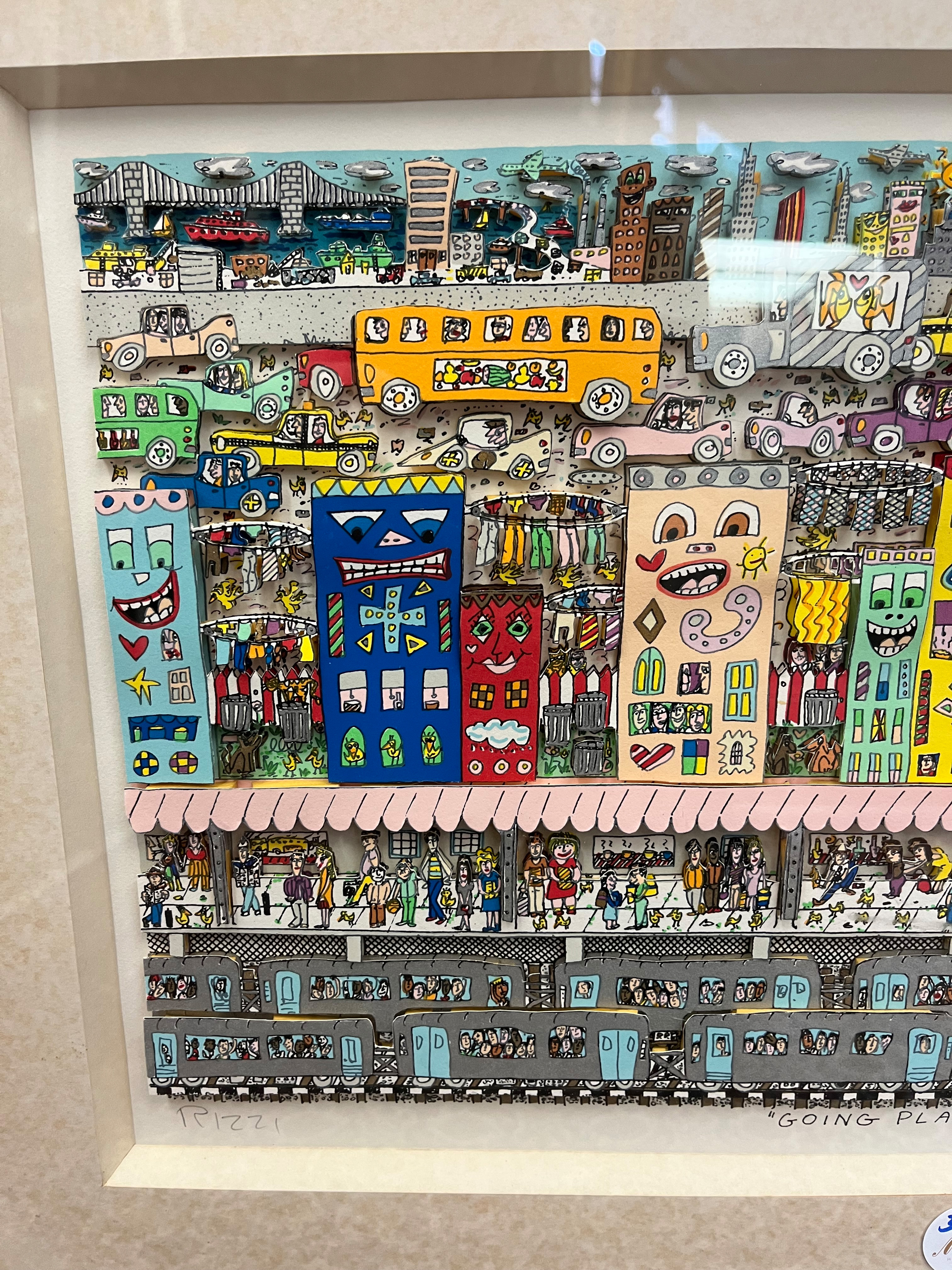 - Katalog-Nr: 351James Rizzi (1950-2011). „Going Places“. Farblithographie mit 3D, Aufl. 80/350, li./u./sign./dat. 1994, mit Passepartout hi./Gl. gerahmt, 28 x 51 cm.o.L.