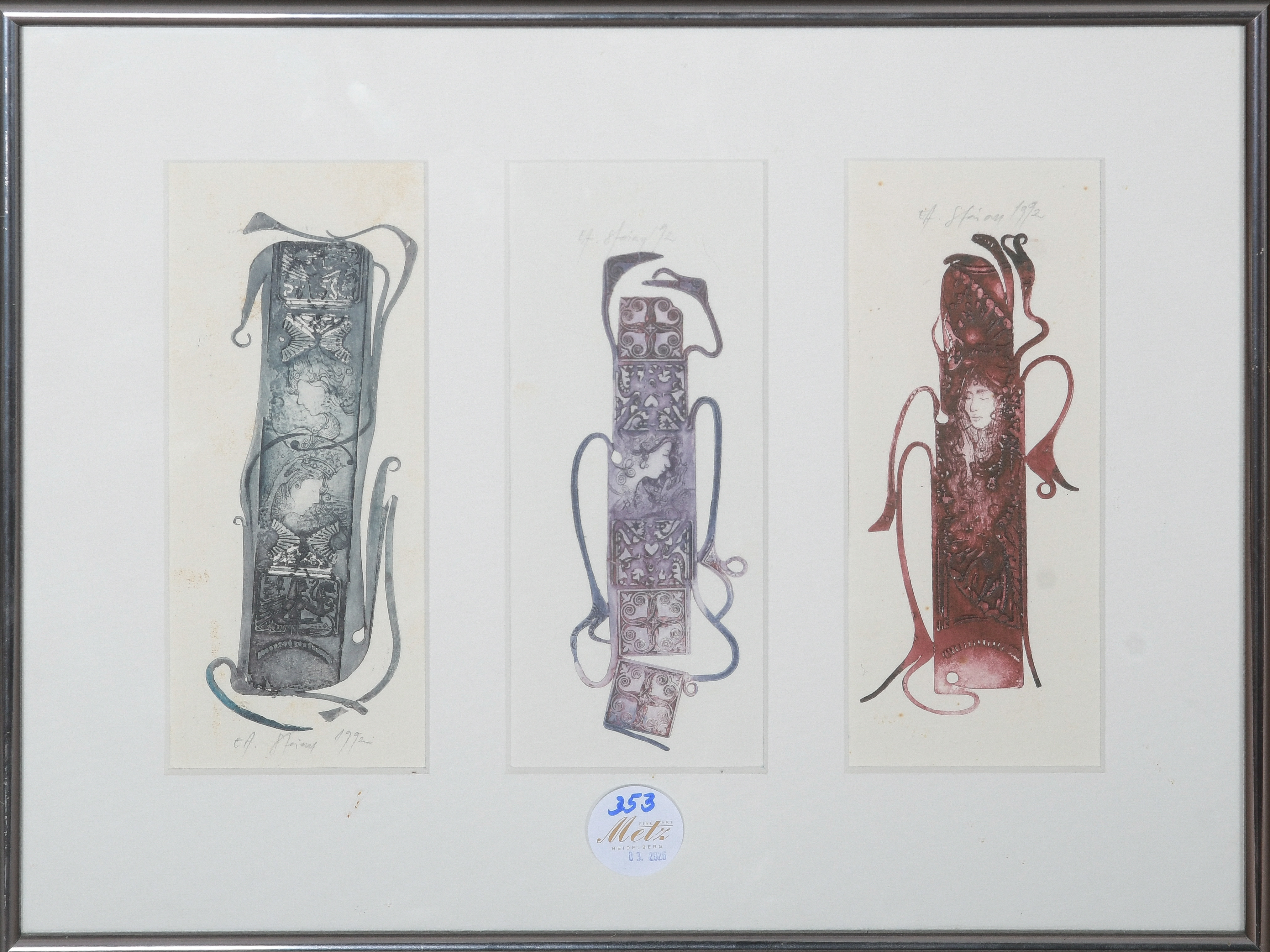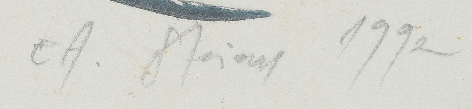 - Katalog-Nr: 353Graphiker des 20. Jhs. Surrealistische Komposition. Farblithographie EA, re./u. bzw. re./o. unleserlich sign./dat. 1992, mit Passepartout hi./Gl. gerahmt, 16 x 5,5 cm.o.L.