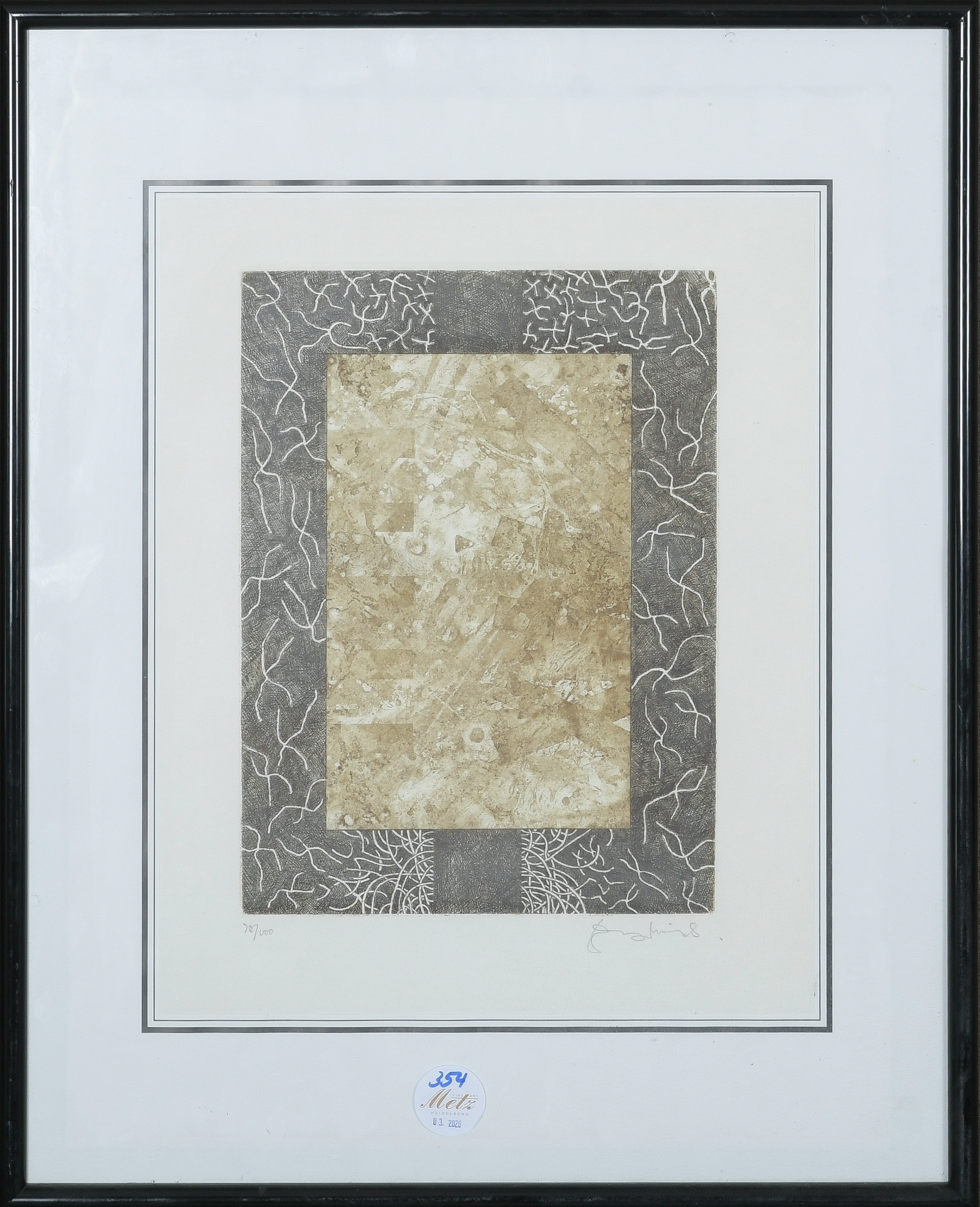 - Katalog-Nr: 359Thomas Lange (*1957). Blütenknospen. Radierung, li./u./sign./dat. 1991, mit Passepartout hi./Gl. gerahmt, 48,5 x 38 cm. Mit Quittung des Mannheimer Kunstvereins, 1991, über DM 430,00.o.L.