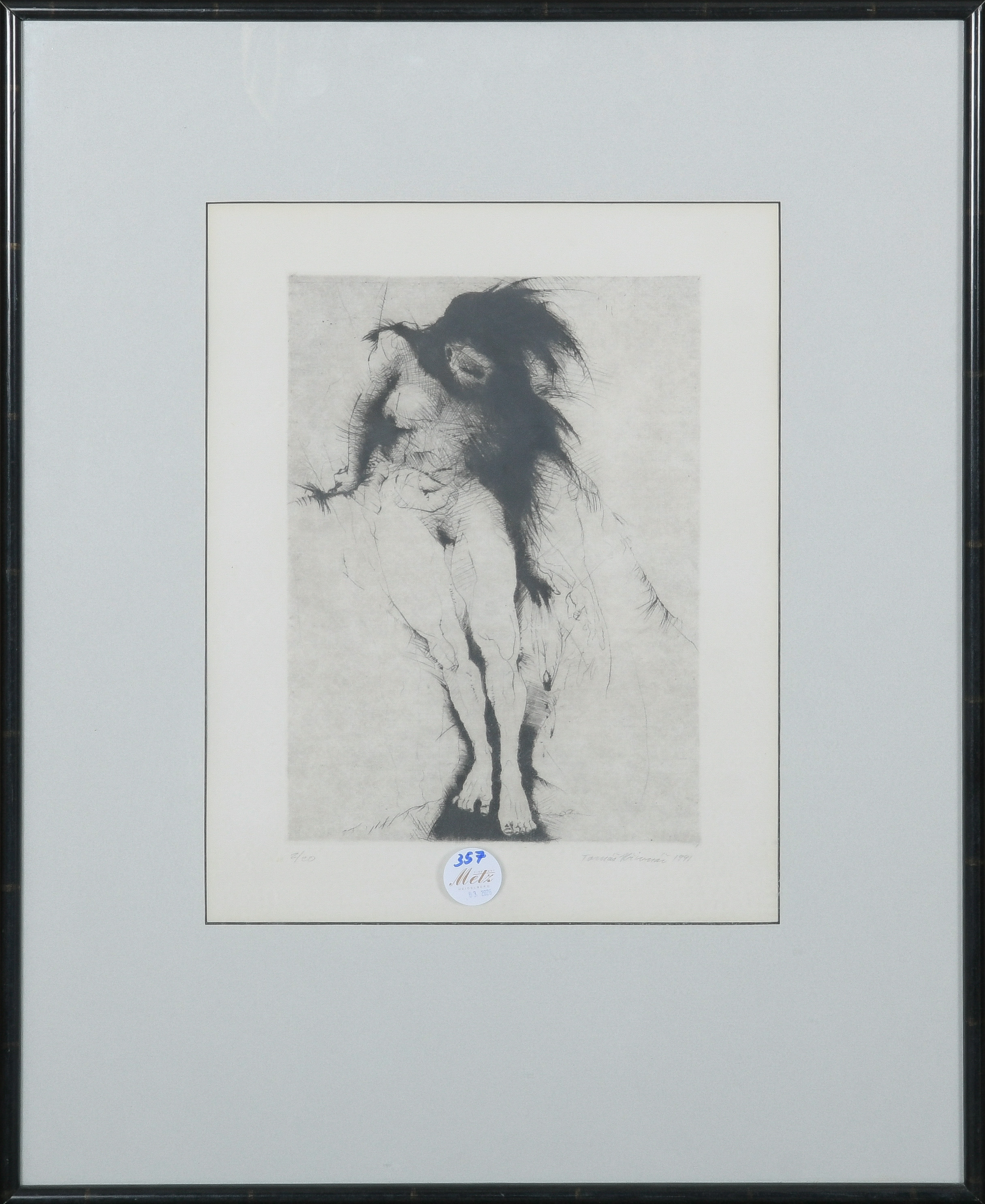 - Katalog-Nr: 357Thomas Hrivnac (*1959). Stehender weiblicher Akt. Holzschnitt 2/20, re./u./sign./dat. 1991, mit Passepartout hi./Gl. gerahmt, 29 x 21 cm.o.L.