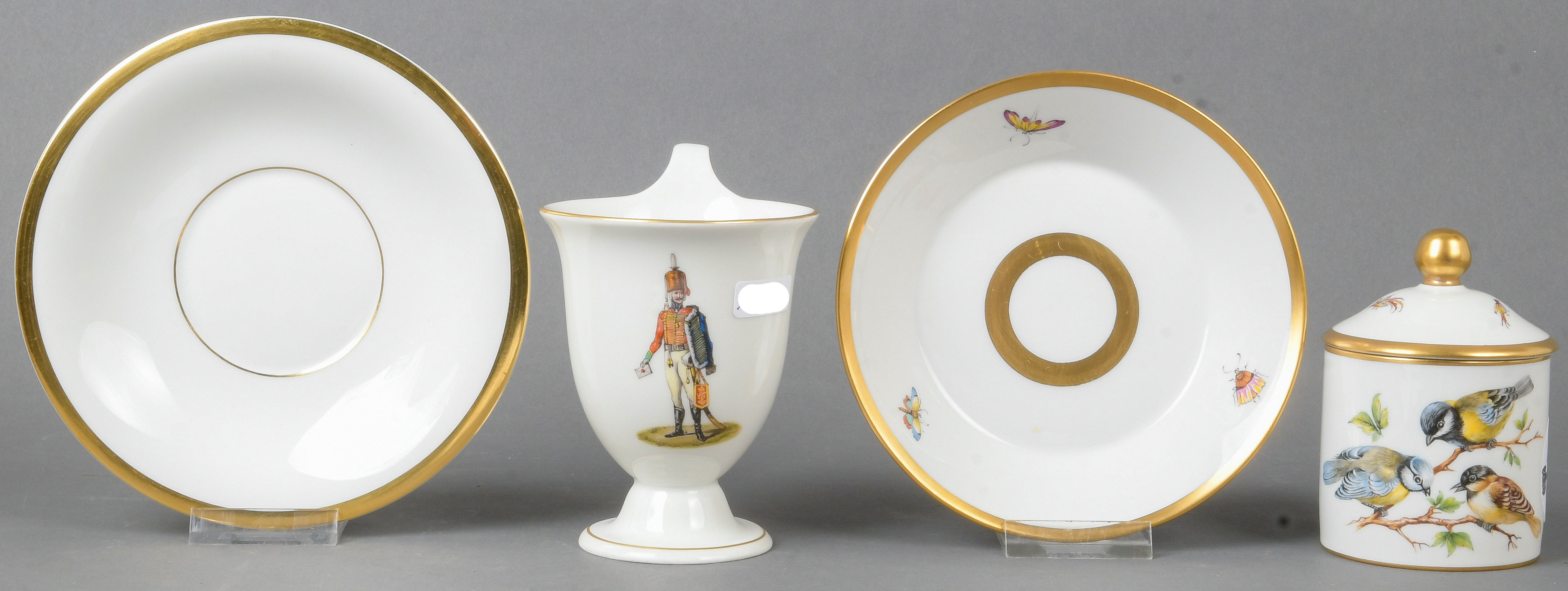 - Katalog-Nr: 371Deckeltasse und Tasse, je mit Unterschale. Berlin 19. Jh. und später. Porzellan, mit Goldrand, Schauseiten bunt bemalt mit Husaren bzw. heimischen Vögeln; am Boden unterglasurblaue Szeptermarke. Provenienz: Privatsammlung Bergstraße/Baden. Erworben bei Dr. Tafel, Weinheim bzw. Berlinghof, Heidelberg 1980.o.L.