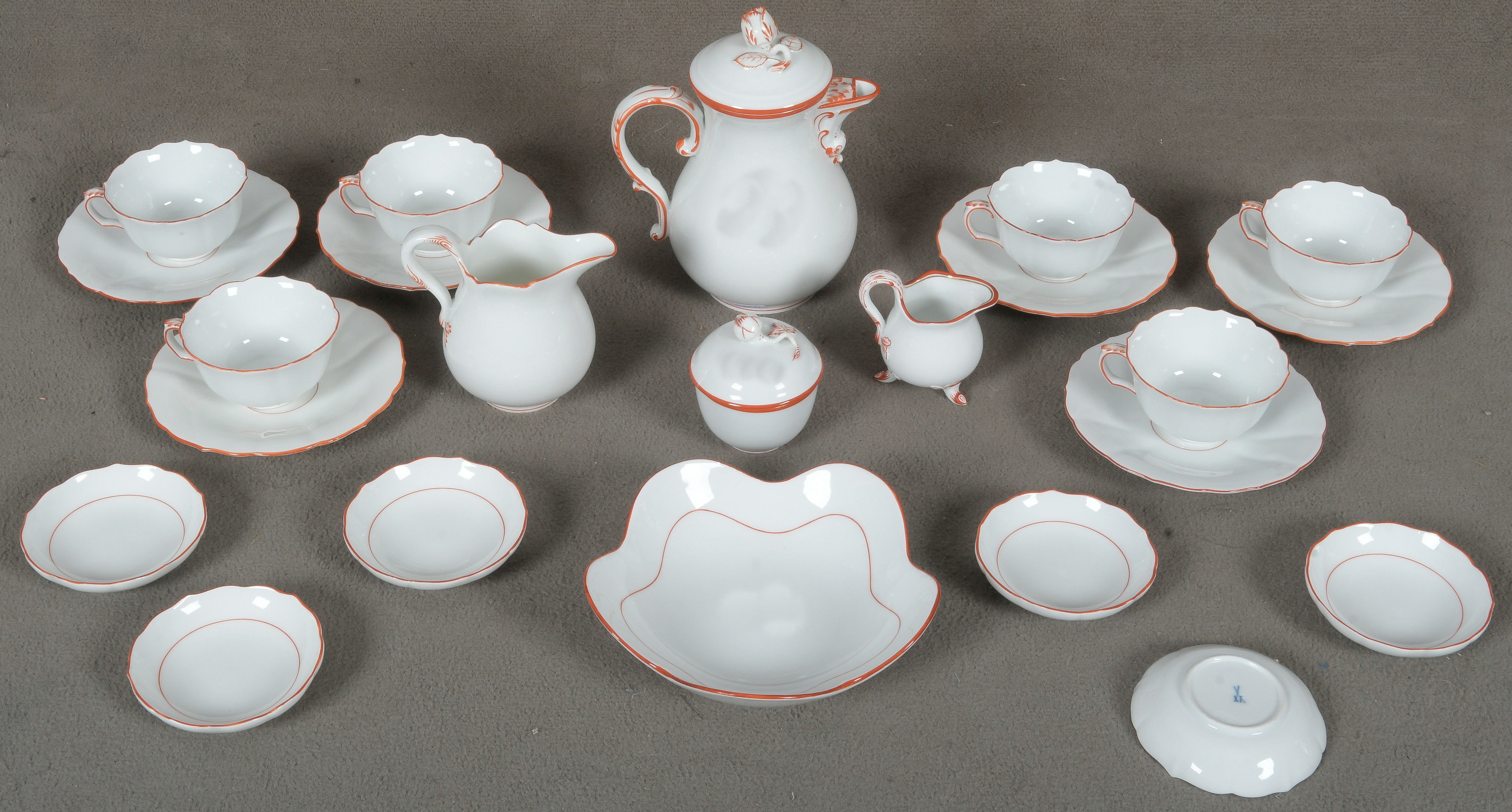 - Katalog-Nr: 37217-tlgs. Mokkaservice. Meissen 20. Jh. Porzellan, mit korallenrot staffiertem Lippenrand; am Boden unterglasurblaue Schwertermarke mit Schleifstrich. Bestehend aus: Eine Mokkakanne (H=16 cm), zwei Milchgießer (H=7 / 9,5 cm), eine Zuckerdose (H=6 cm, D=5,8 cm), sechs Mokkatassen mit Unterschalen, sechs kleine Schälchen (D=je 8 cm) und eine Schale (D=15 cm).o.L.