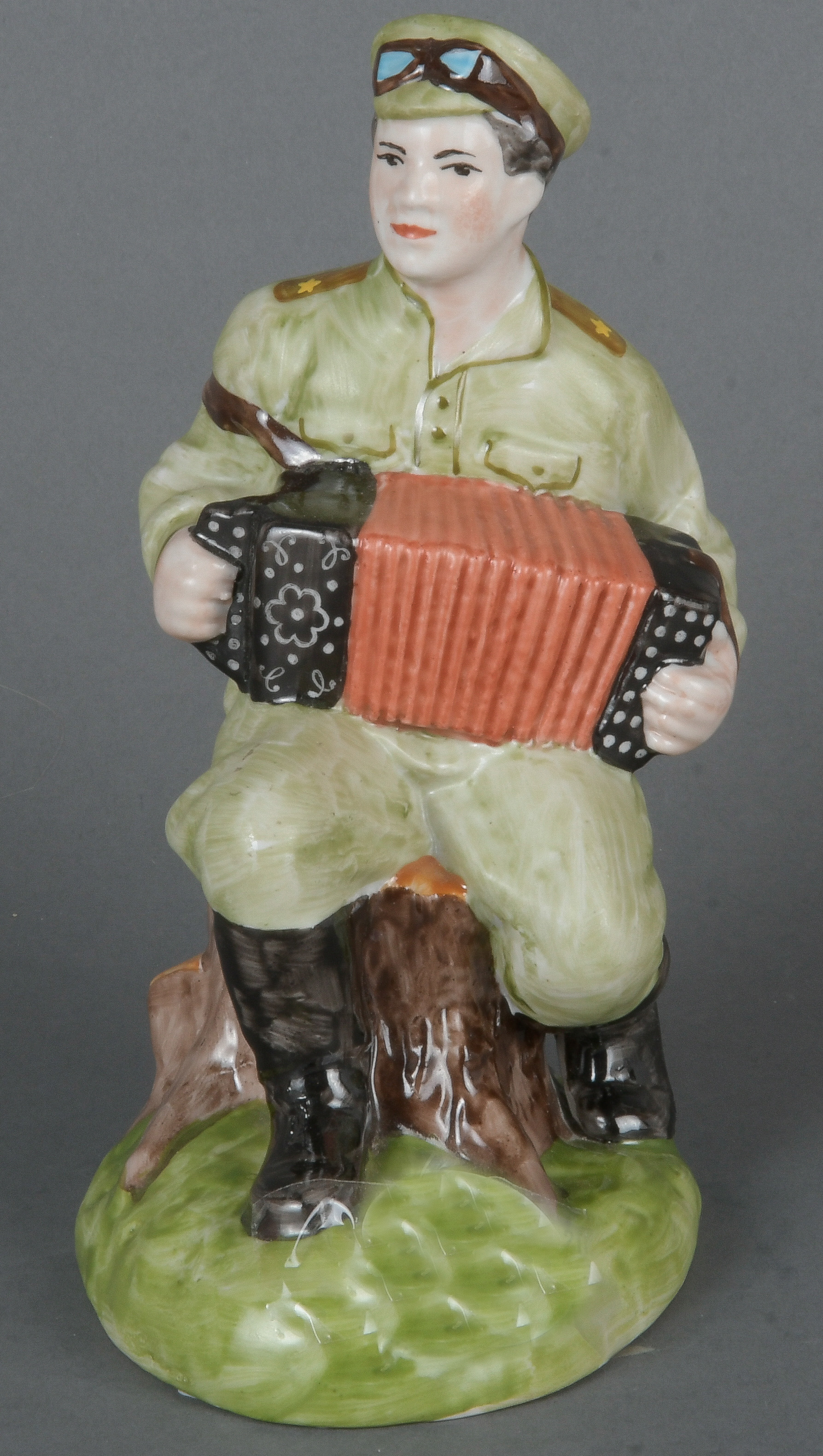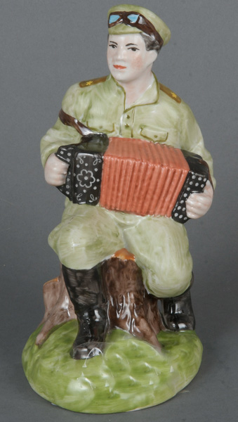 - Katalog-Nr: 374Sitzender Soldat, Ziehharmonika spielend. Russland. Porzellan, bunt bemalt, am Boden sign., H=19,5 cm.o.L.