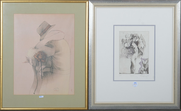 - Katalog-Nr: 365Ernst Fuchs (1930-2015). „2 Bll. Zyklopische Landschaft. Hain der Daphne“ (1967). Aquatintaradierung 19/200, re./u./sign., hi./Gl. gerahmt, 21 x 47 cm.o.L.