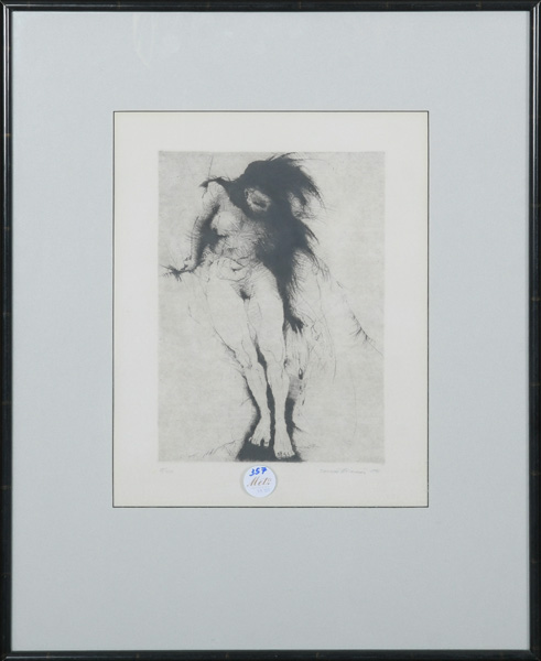 - Katalog-Nr: 358Willi Kissmer (1951-2018). „Der Traum“. Farbradierung 173/250, re./u./sign., mit Passepartout hi./Gl. gerahmt, 41,5 x 25,5 cm. Rechnung von DIE GALERIE, Offenbach 26.07.1993, über DM 260,00 liegt vor.o.L.