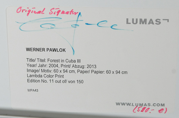 - Katalog-Nr: 363Werner Pawlok (*1953). „Forest in Cuba III“. Printabzug 2013, verso sign., hi./Gl. gerahmt, 60,6 x 94 cm.o.L.