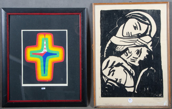 - Katalog-Nr: 366Will Torger (1910-1984). Beweinung Christi. Holzschnitt, re./u./sign., li./u./bez. „Handabzug 3/8“ (60 x 42 cm); dazu Maler des 20. Jhs. Kreuz. Mischtechnik, collagiert, mittig/u./monogr. „LK“ (37 x 30 cm). Je hi./Gl. gerahmt. (ein Glas besch.)o.L.
