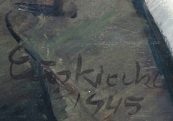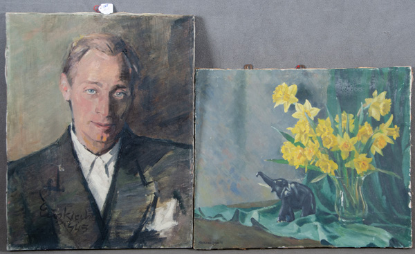 - Katalog-Nr: 368Maler des 20. Jhs. Stillleben mit Blumen und Elefant. Öl/Lw., re./u./sign./dat. (19)47 (50 x 60 cm); dazu Porträt. Öl/Lw., li./u. unleserlich sign./dat. 1945, 65 x 50 cm. (besch.)o.L.