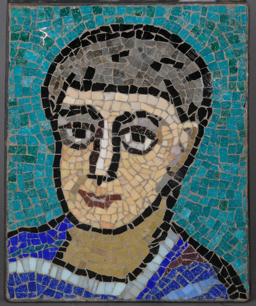 - Katalog-Nr: 375Herrenkopf in Mosaiktechnik, in Eisenrahmen, verso bez. „S. Rottluff“, 26 x 20 cm. (besch.)o.L.