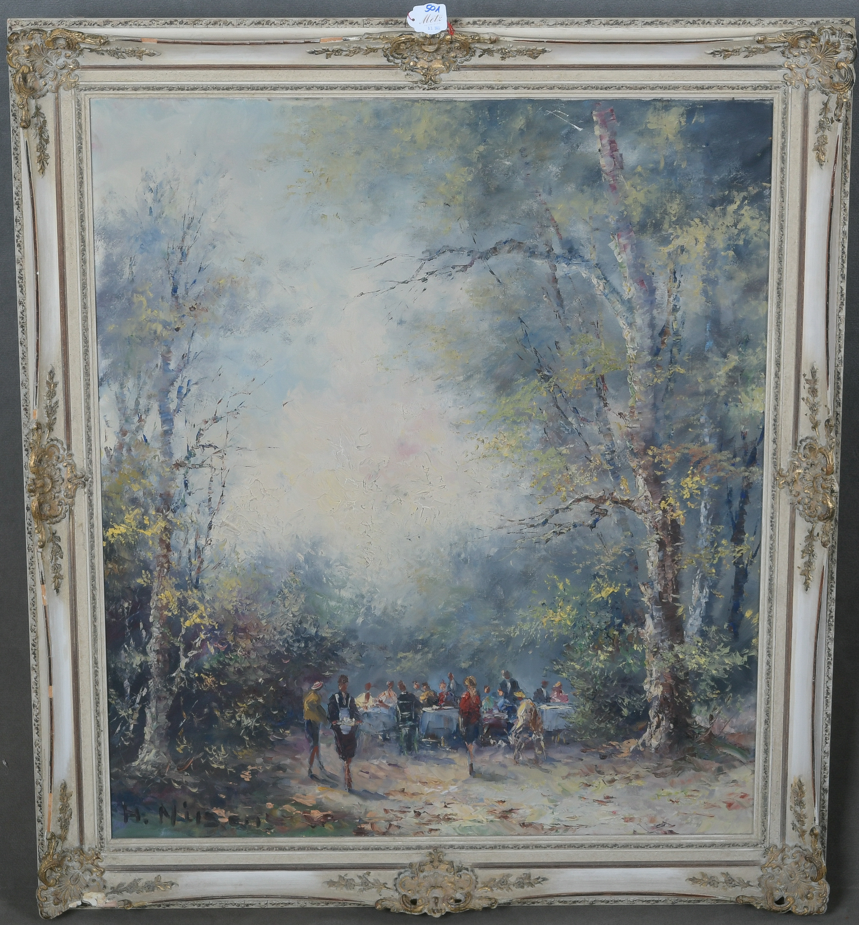 - Katalog-Nr: 501H. Nilsen (Maler des 20. Jhs.). Waldschneise mit Tischgesellschaft. Öl/Lw., li./u./sign., gerahmt, 80 x 70 cm.o.L.