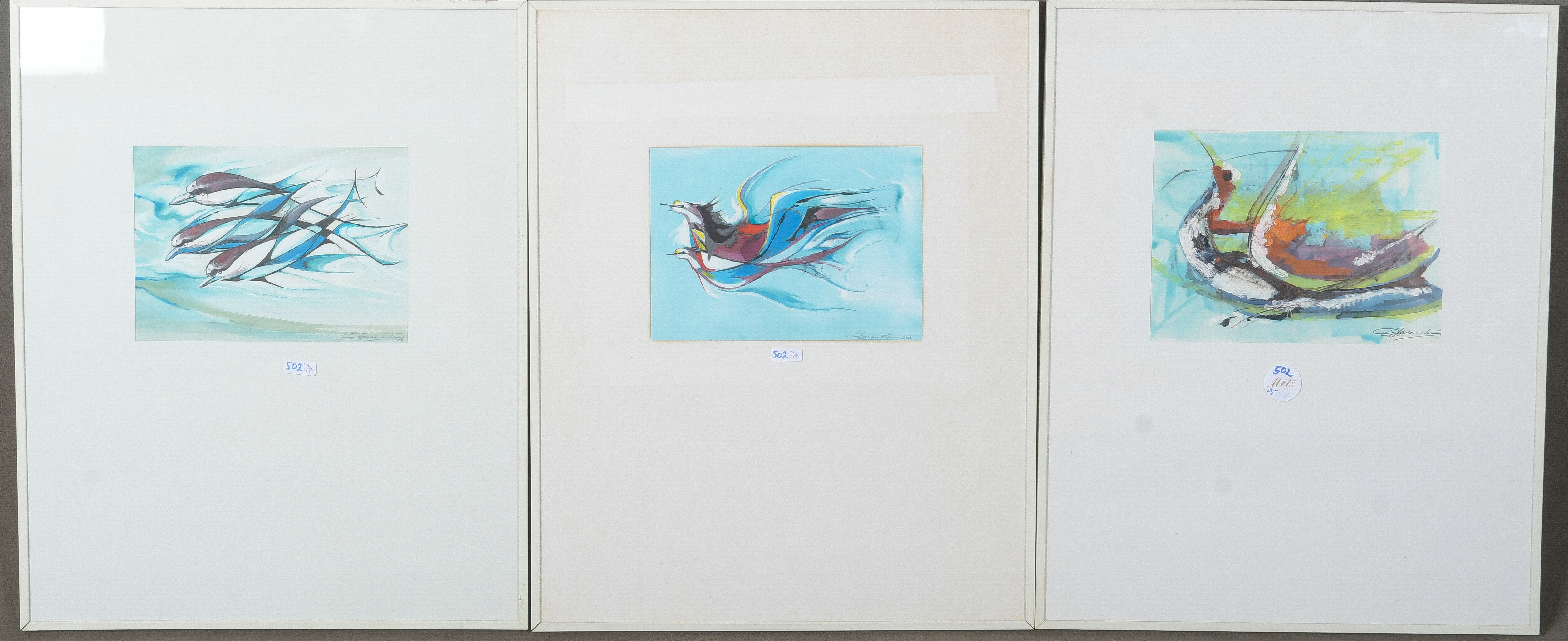 - Katalog-Nr: 502Maler des 20./21. Jhs. Drei Mischtechniken mit Vogel- bzw. Delphindarstellungen, re./u./sign./dat. 2003, mit Passepartout hi./Gl. gerahmt, je 17 x 23 cm.o.L.