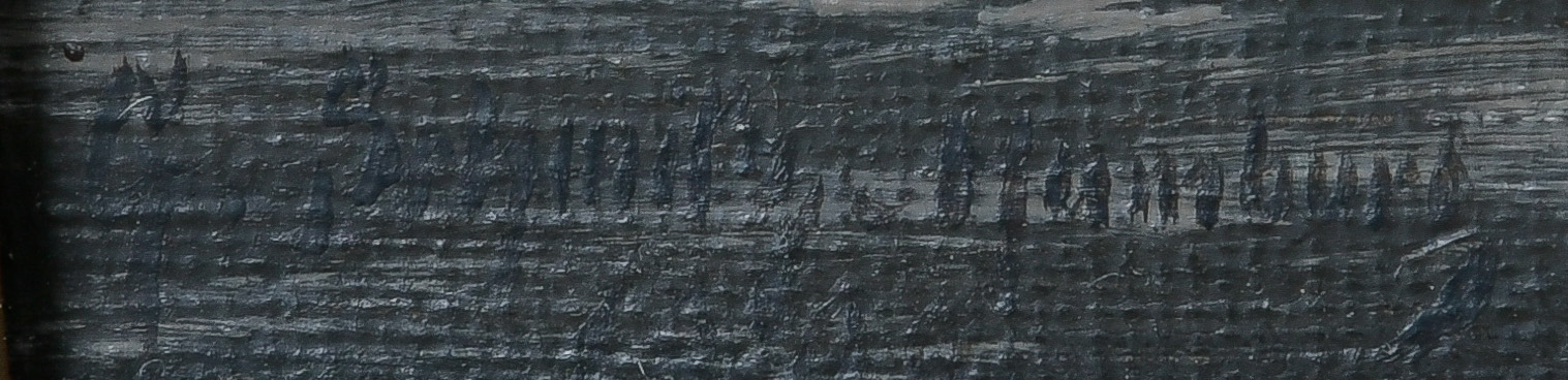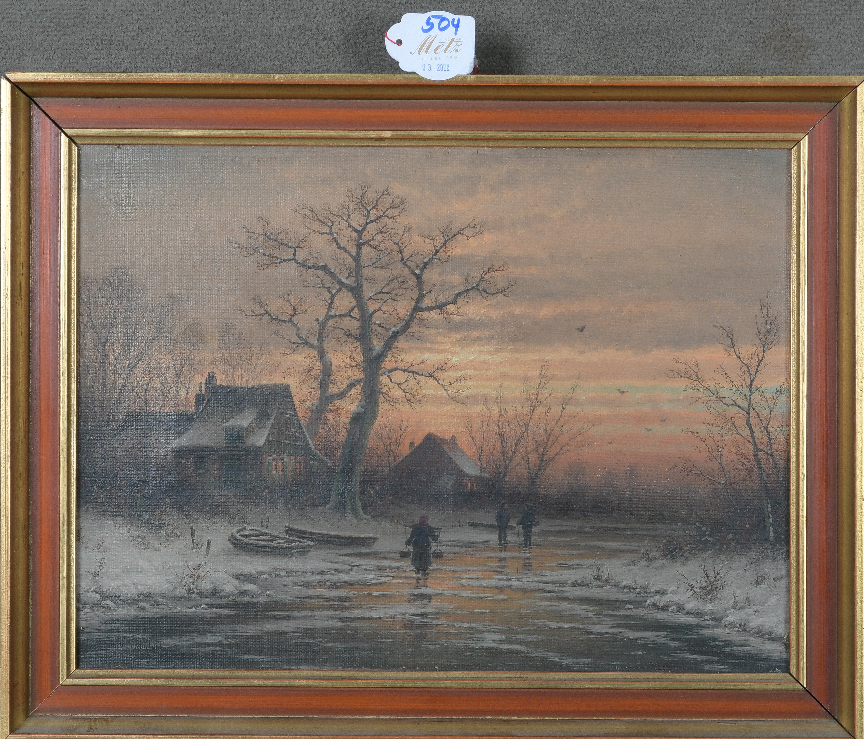 - Katalog-Nr: 504Georg Schmitz (1851-1917). Winterlandschaft mit Personenstaffage und Gebäude. Öl/Lw., li./u./sign./bez. „Hamburg“, gerahmt, 24,5 x 32,5 cm.o.L.