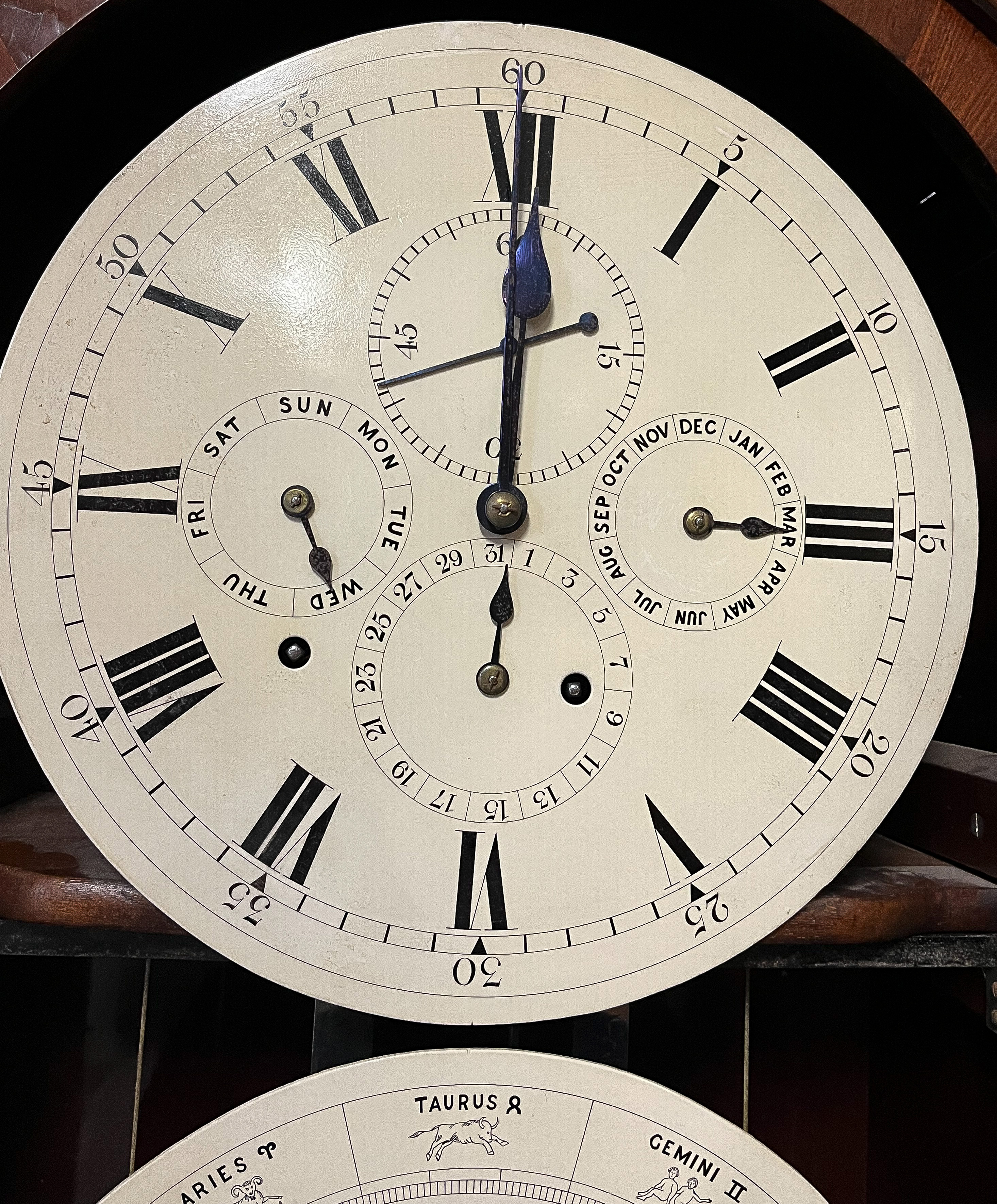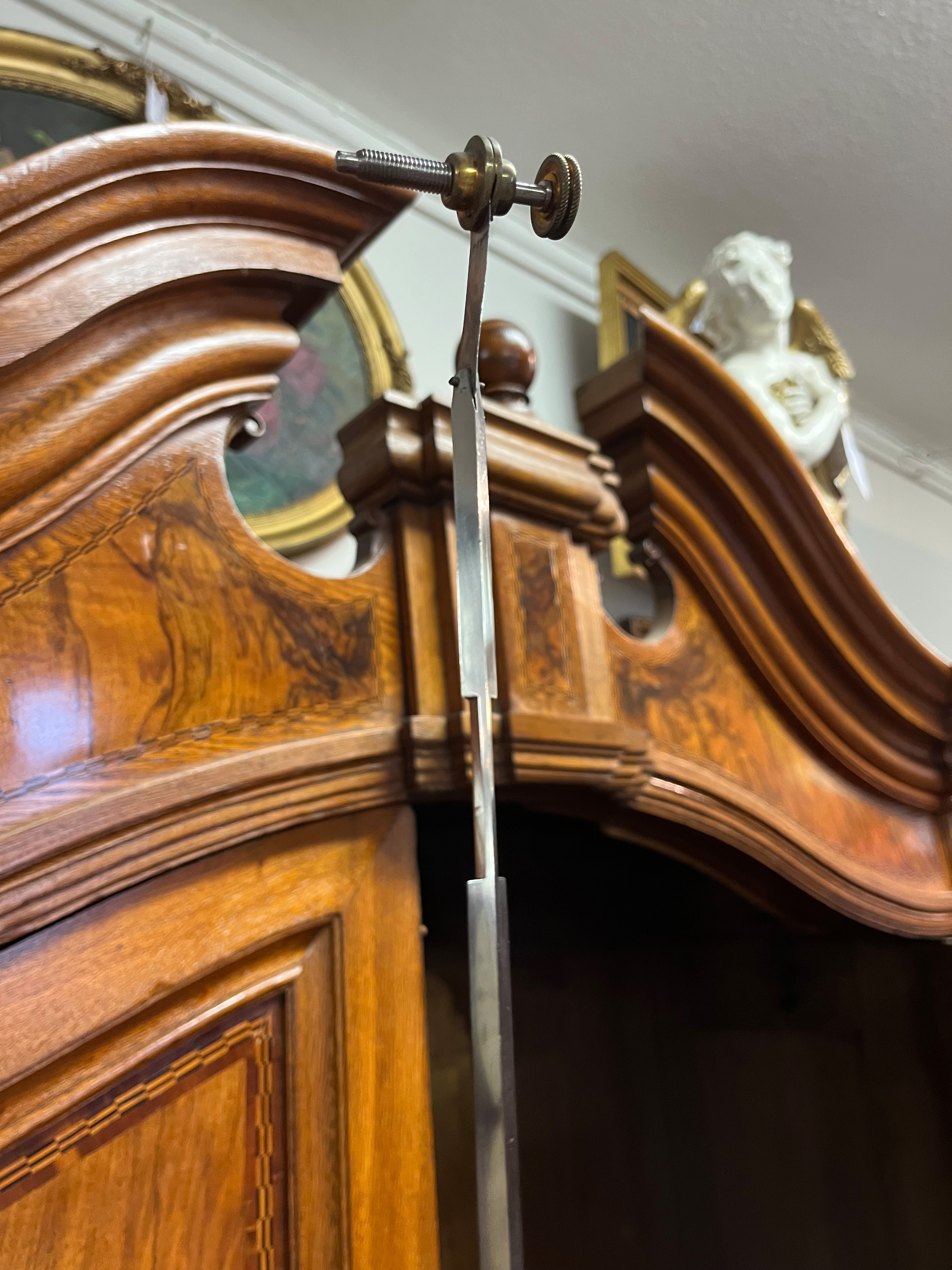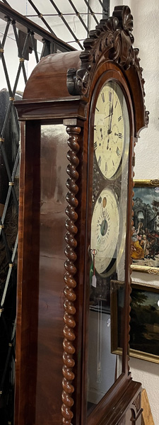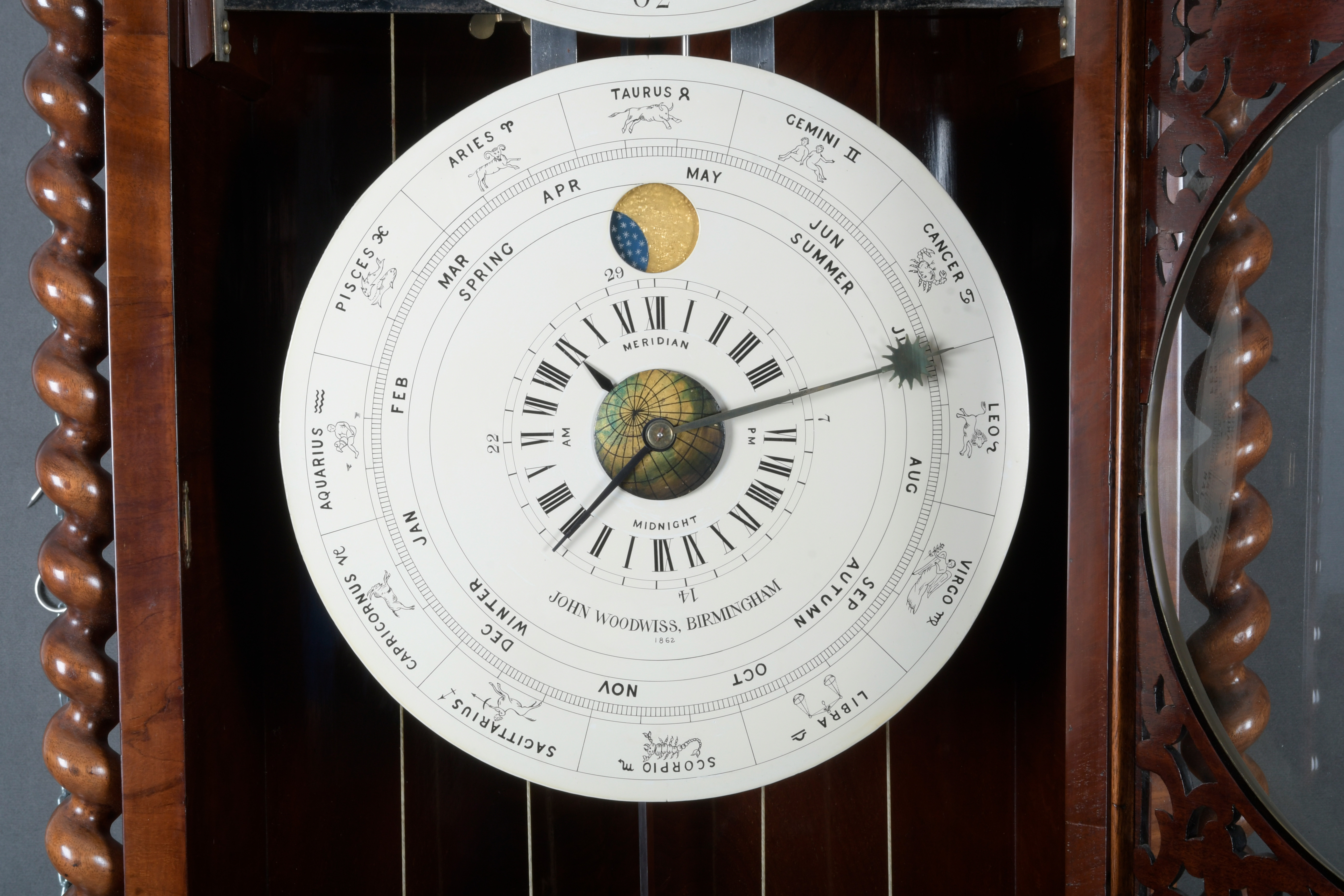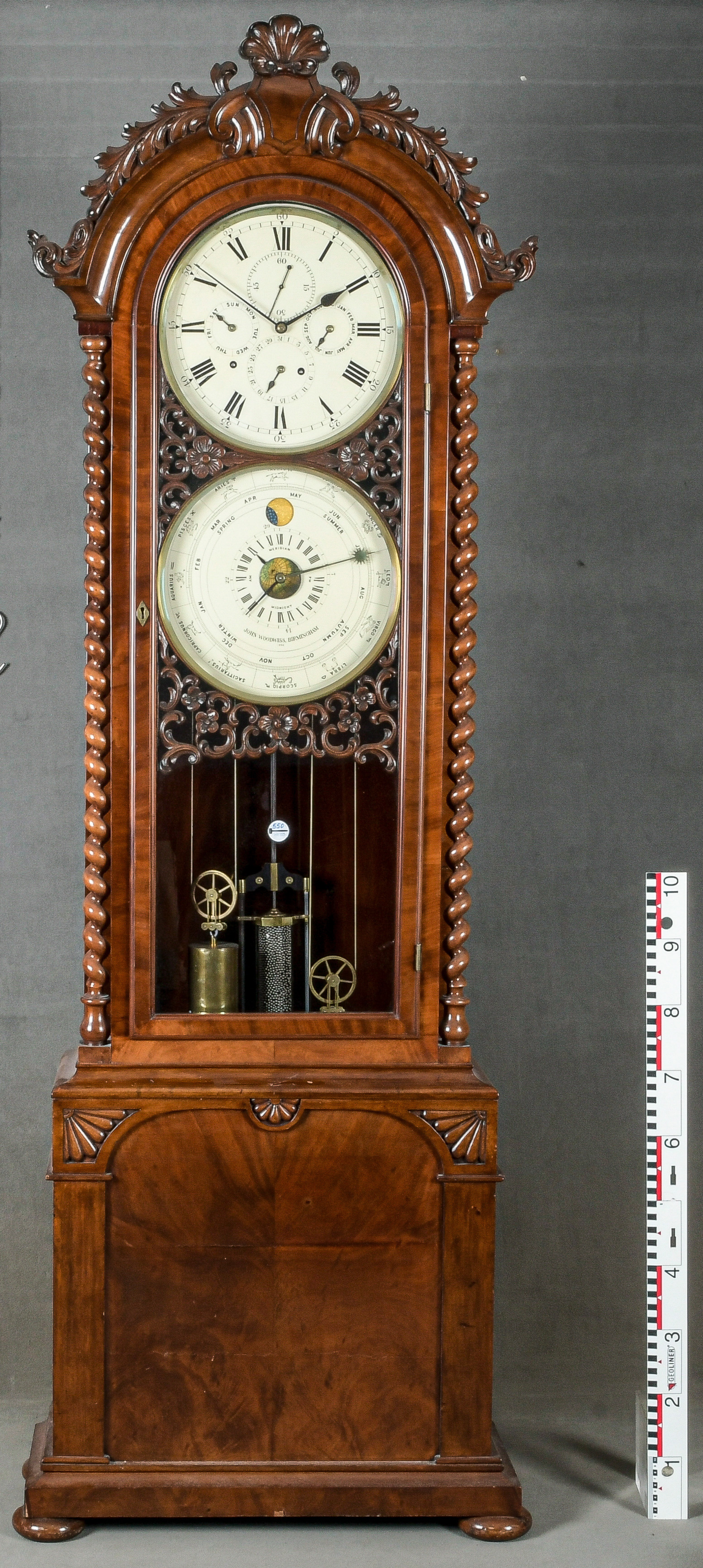 - Katalog-Nr: 505Musealer Präzisionsregulator-Monatsläufer. Birmingham, Meister John Woodwiss dat. 1862. Mahagoni furniert, teilw. massiv und geschnitzt. Hochrechteckig, auf Kugelfüßen mit quaderförmigem Sockel und verglastem, gewölbtem Uhrenkasten mit verschlungenen Blättern, Muschelverzierungen und spiralförmigen Säulen. Der Regulator weist insgesamt 11 Funktionen auf: Das obere Ziffernblatt mit regulärer Minuten- und Stundenanzeige, plus separate Anzeigen für Sekunden, Datum, Wochen- und Monatstag. Das untere Ziffernblatt mit äußerem jährlichen Kalenderring (mit Jahreszeiten und Tierkreiszeichen), plus separate Anzeigen für Mondphase und -daten, Tages- und Nachtanzeige und eine separate Globusanzeige, sign./dat. Effektive 5-Säulen-Drehung, mit träger Hemmung, verzierter Drehscheibe, Quecksilberpendel mit Drehspannung und kristallenem Glas, doppeltem Gewichtlaufwerk mit gleichbleibender Energie, 5-rädiges Laufwerk mit großen Getriebezahnrädern und 6-zackigen Zahnrädern, durchgehender Schlag zur Stunde mit einem Gong und zur Viertelstunde mit einem Klingeln, Gestänge mit Getriebegangschaltung zum Kalendermechanismus, H=225 cm, B=67 cm, T=26,5 cm. Provenienz: Richard Redding, Zürich SFR 45.000,00. (Funktion ungeprüft)o.L.