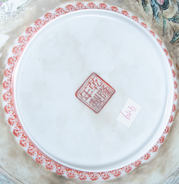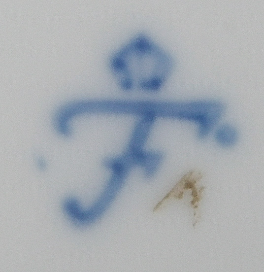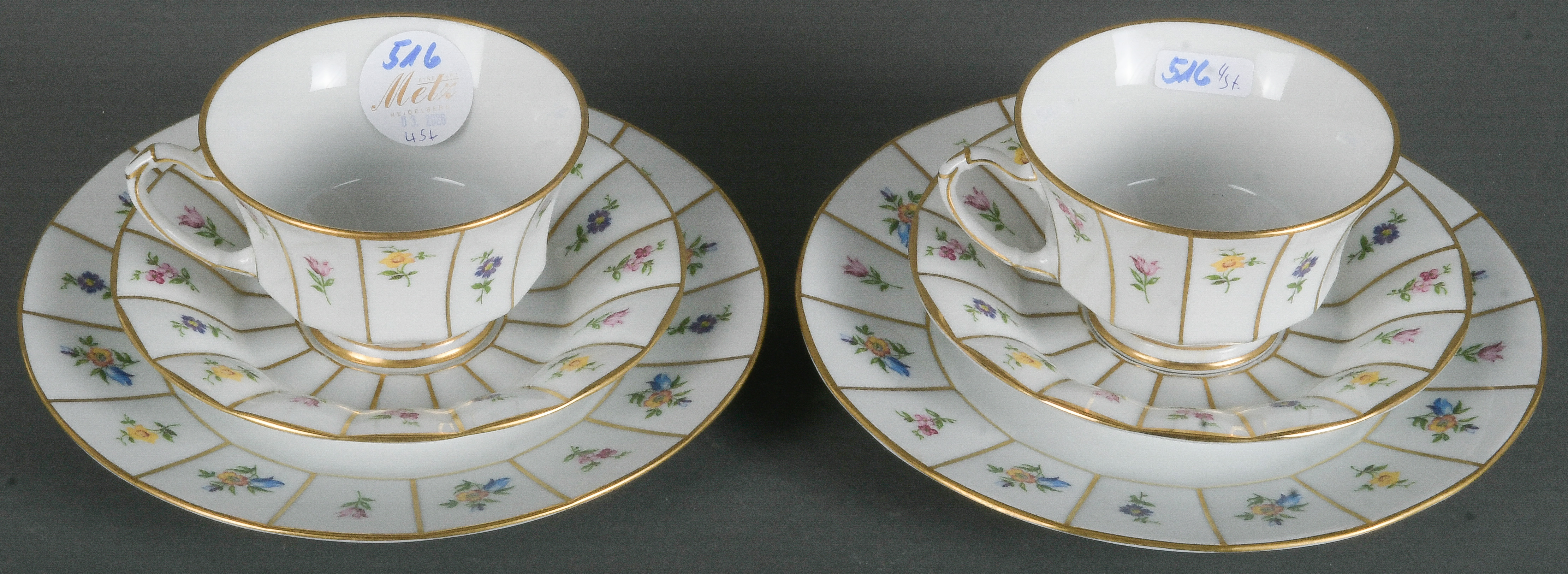 - Katalog-Nr: 516Paar Gedecke. Fürstenberg 20. Jh. Porzellan, bunt bemalt mit Streublumen, Goldrand; am Boden gemarkt, D=19,2 cm.o.L.