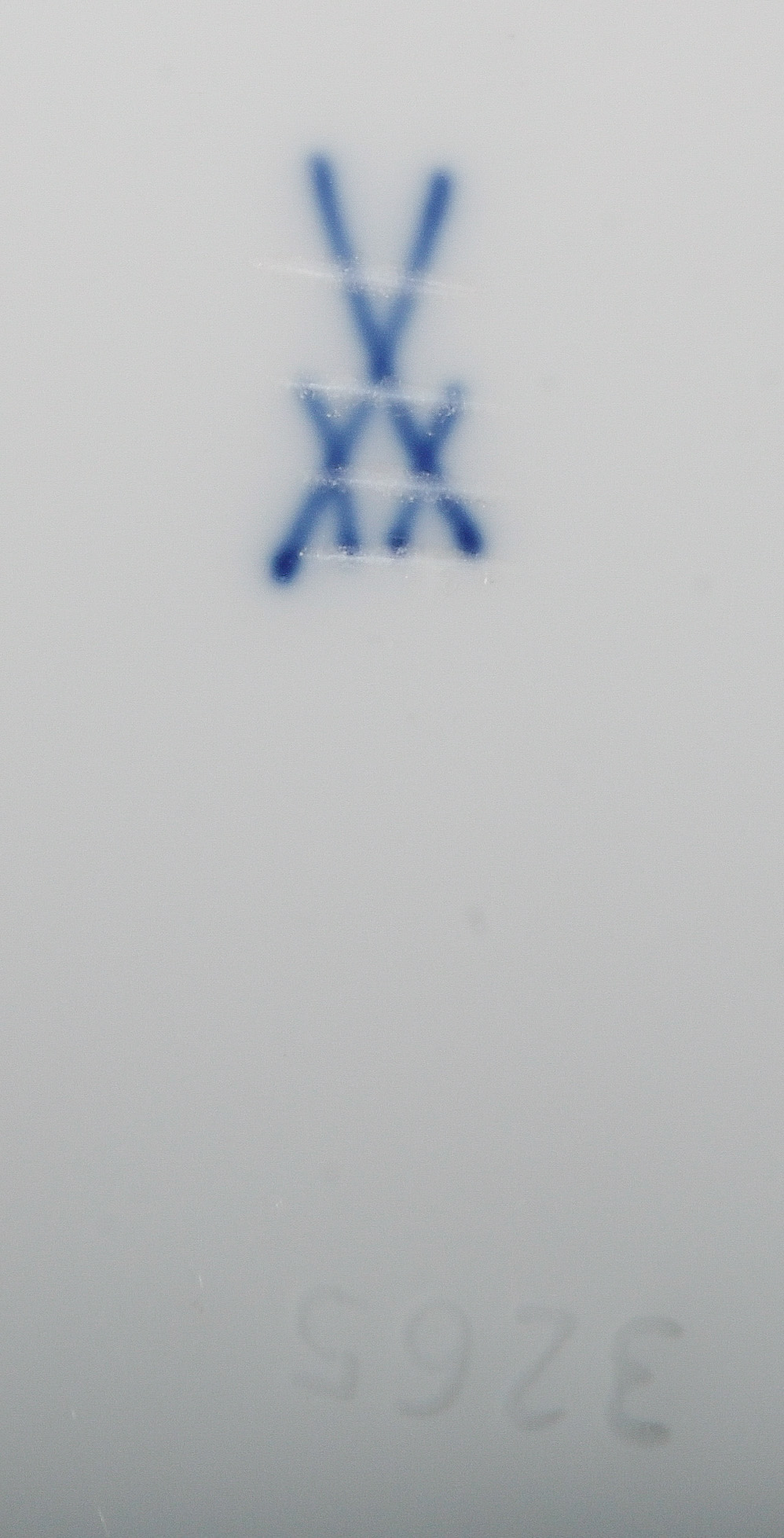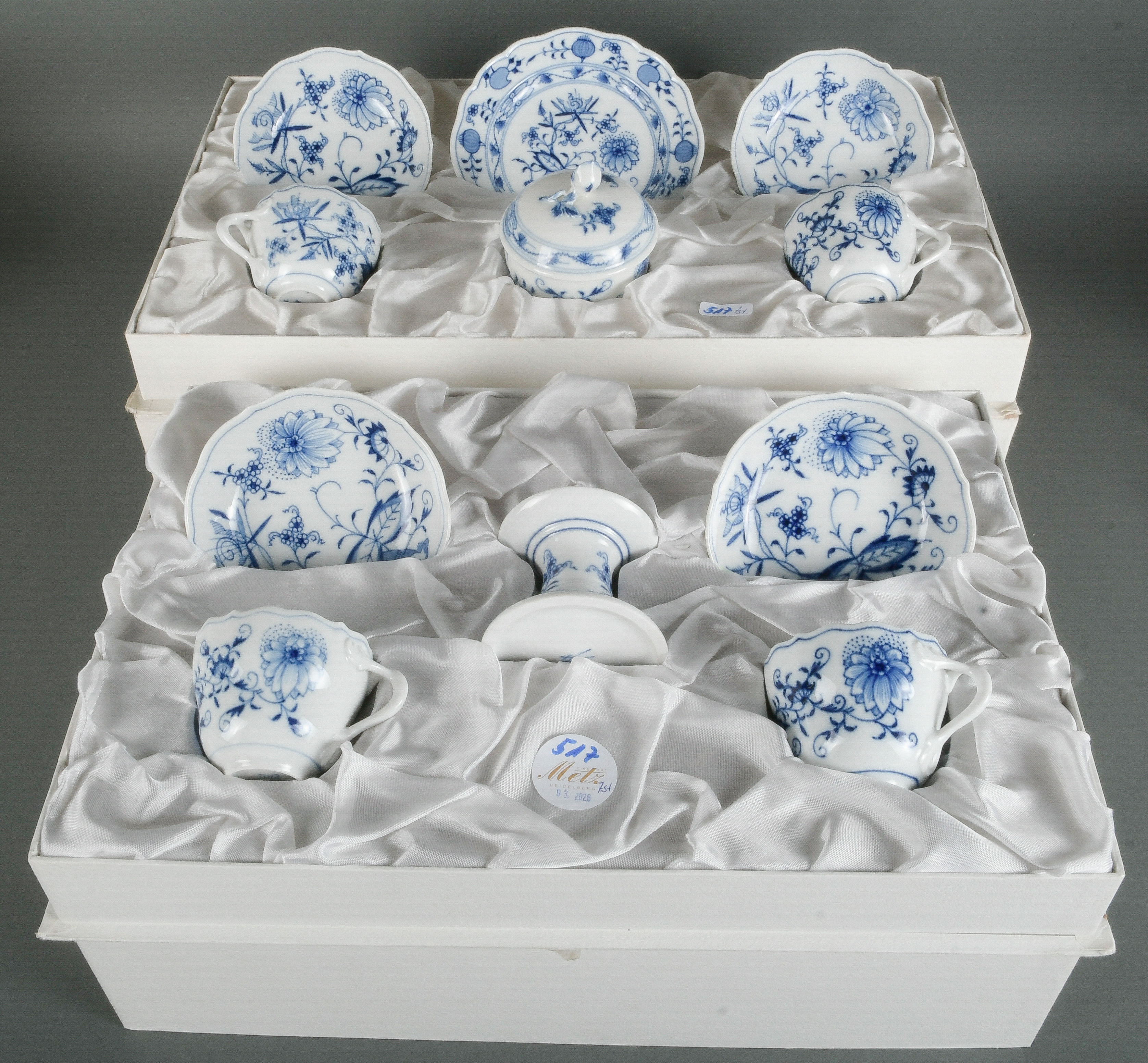 - Katalog-Nr: 517Siebentlgs. Konvolut „Zwiebelmuster“. Meissen 20. Jh. Porzellan, unterglasurblau bemalt; am Boden unterglasurblaue Schwertermarke. Bestehend aus: Ein Kerzenleuchter (H=6,5 cm), eine Zuckerdose (H=7,5 cm), ein Teller (D=14,5 cm) und vier Mokkatassen mit Unterschalen. Alle Teile im Original-Karton, H=10,5 cm, B=37,5 cm, T=25 cm / H=12 cm, B=43 cm, T=25,5 cm.o.L.