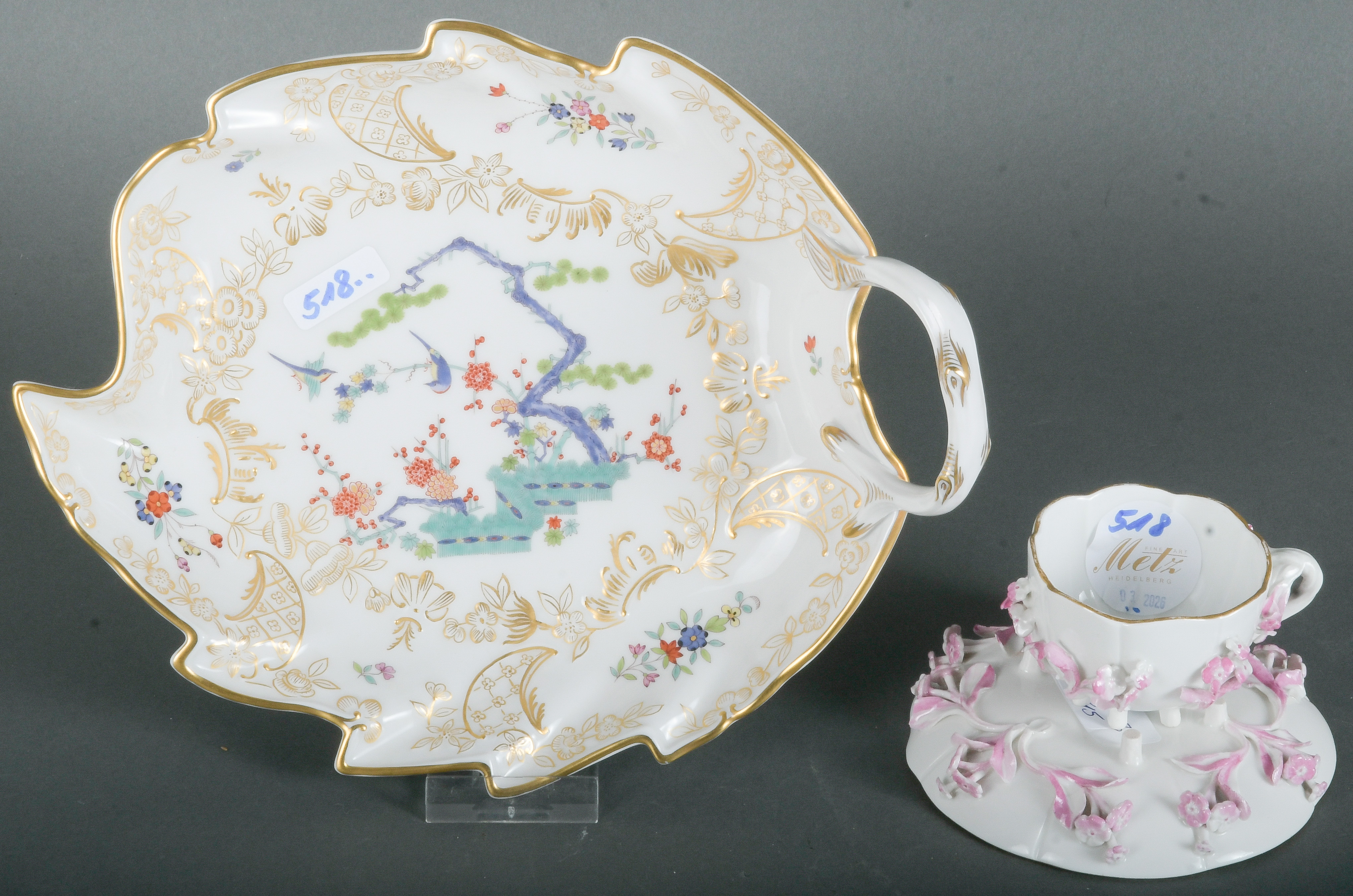 - Katalog-Nr: 518Zweitlgs. Konvolut Meissen 19./20. Jh. Porzellan, am Boden unterglasurblaue Schwertermarke mit Schleifstrichen. Bestehend aus: Eine Blattschale (H=7 cm, B=23 cm, T=19 cm) und eine Mokkatasse mit Unterschale. (best.)o.L.