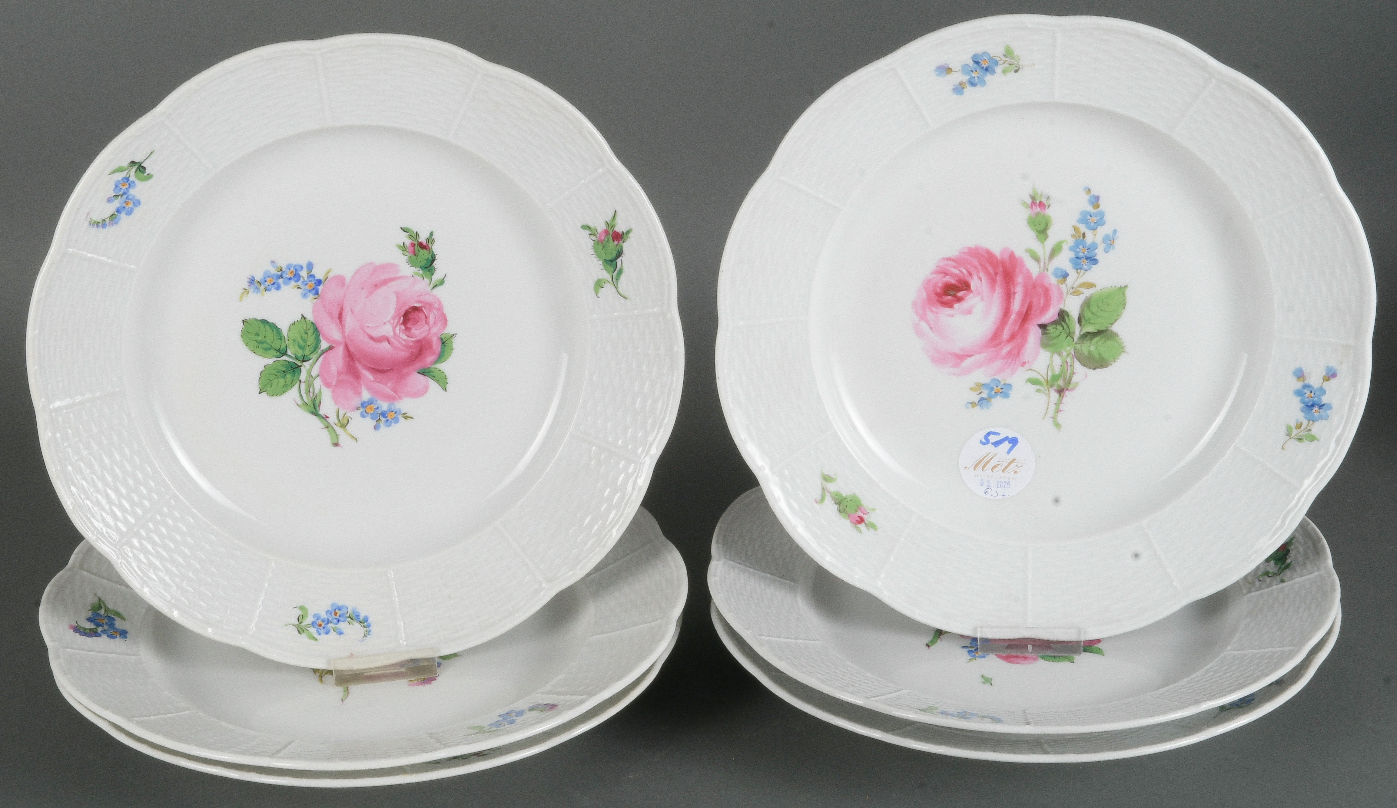 - Katalog-Nr: 519Sechs Speiseteller „Rote Rose“. Meissen 20. Jh. Porzellan, mit Korbflechtrelief und bunt bemalt mit dem namensgebendem Dekor; verso unterglasurblaue Schwertermarke, D=je 25,5 cm.o.L.