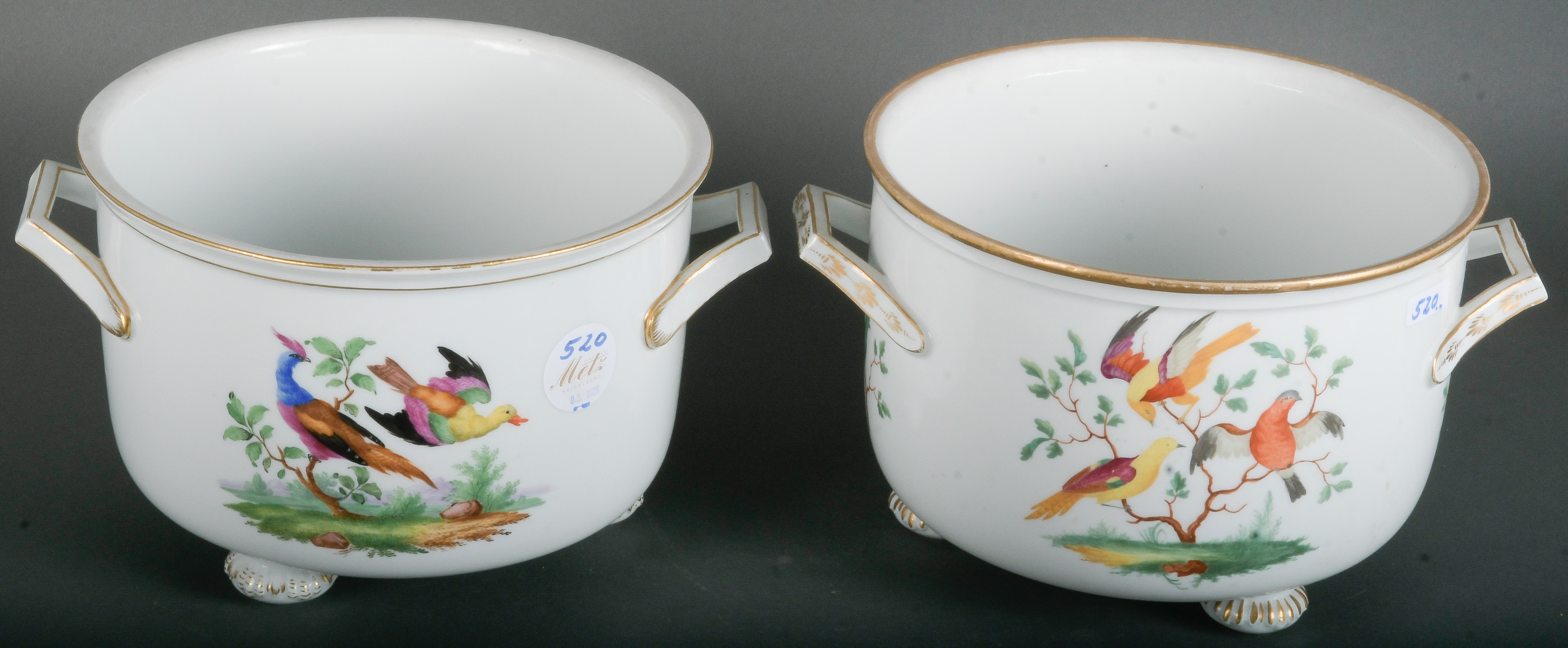 - Katalog-Nr: 520Paar Henkelgefäße. Meissen 19. Jh. Porzellan, bunt bemalt mit heimischen Vögeln auf Ästen sitzend in Landschaft, Ränder gold gesäumt; verso unterglasurblaue Schwertermarke, H=15 cm, D=21 cm. (best.)o.L.