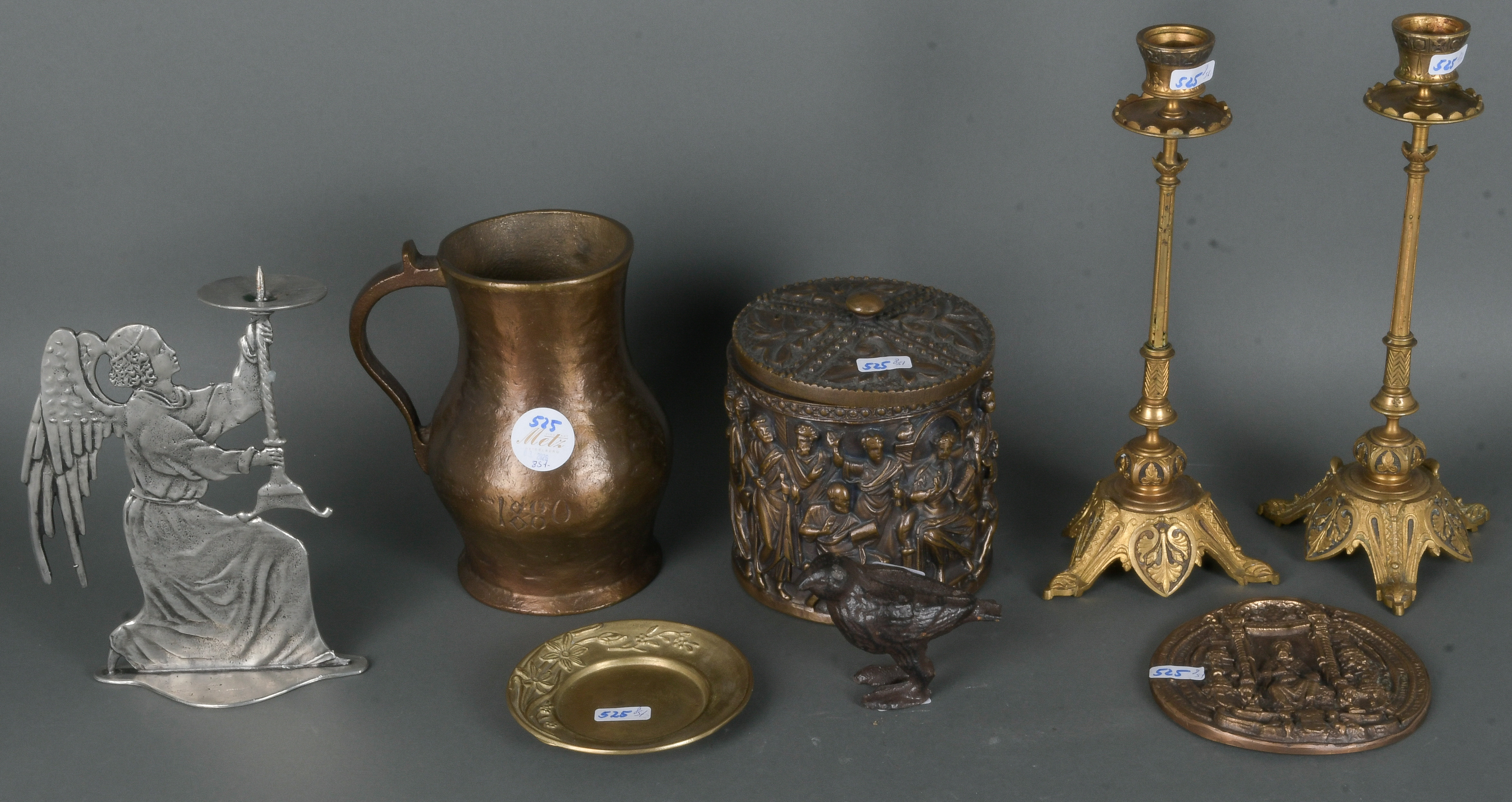 - Katalog-Nr: 525Achttlgs. Konvolut Bronze / Messing / Zinn. Deutsch 19./20. Jh. Bestehend aus: Ein Paar Leuchter (H=28 cm), ein Engelsleuchter (H=20 cm), eine runde Deckeldose (H=13 cm, D=13,5 cm), ein Birnenkrug, dat. 1880 (H=18 cm), eine kleine Schale (D=11,5 cm), eine Reliefplakette (D=13,5 cm), und eine Vogelfigur (H=8 cm).o.L.