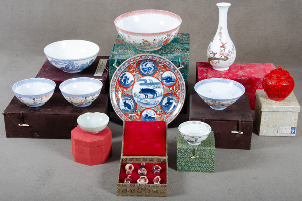 - Katalog-Nr: 506Zwölftlgs. Konvolut Asiatika: Sieben Porzellanschalen, bunt bemalt (H=4,5 bis 11 cm, D=11,5 bis 28 cm) im Etui, zwei Miniatur-Vasen (H=5 / 6 cm), eine Rotlack-Deckeldose (H=13 cm, D=11 cm), ein Teller (D=30 cm) und eine Vase (H=28 cm). (besch.)o.L.