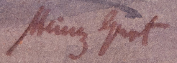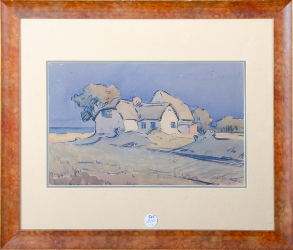 - Katalog-Nr: 515Heinz Grot (1901-1995). „FISCHERHAUS b. NIEBLUM a. FÖHR“. Aquarell/Karton, re./u./sign., mit Passepartout hi./Gl. gerahmt, 50 x 60 cm.o.L.