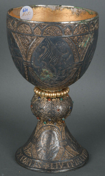 - Katalog-Nr: 521Großer Abendmahlkelch. Deutsch 19. Jh. Bronze, teilw. vergoldet, ziseliert, graviert und besetzt mit Farbsteinen; ohne Marke, H=27 cm.o.L.