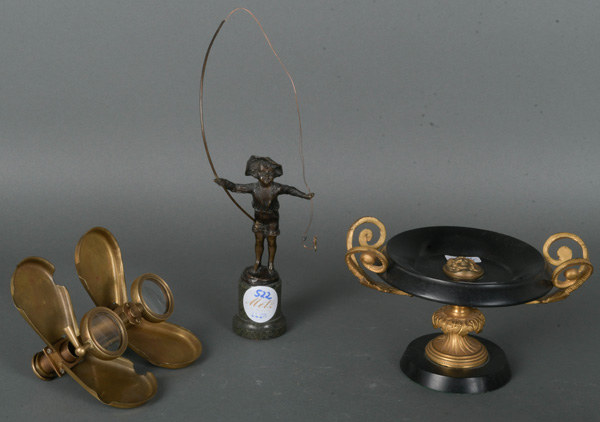 - Katalog-Nr: 522Dreitlgs. Konvolut Bronze / Messing. Deutsch / Frankreich 19./20. Jh. Bestehend aus: Stehender Fischerknabe auf Marmorsockel, Modell wohl von Franz Iffland (H=15 / 24 cm), ein Tafelaufsatz (H=11,5 cm, D=13 cm) und ein zusammenklappbares Opernglas.o.L.