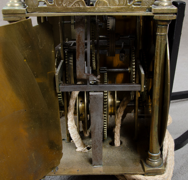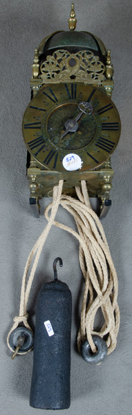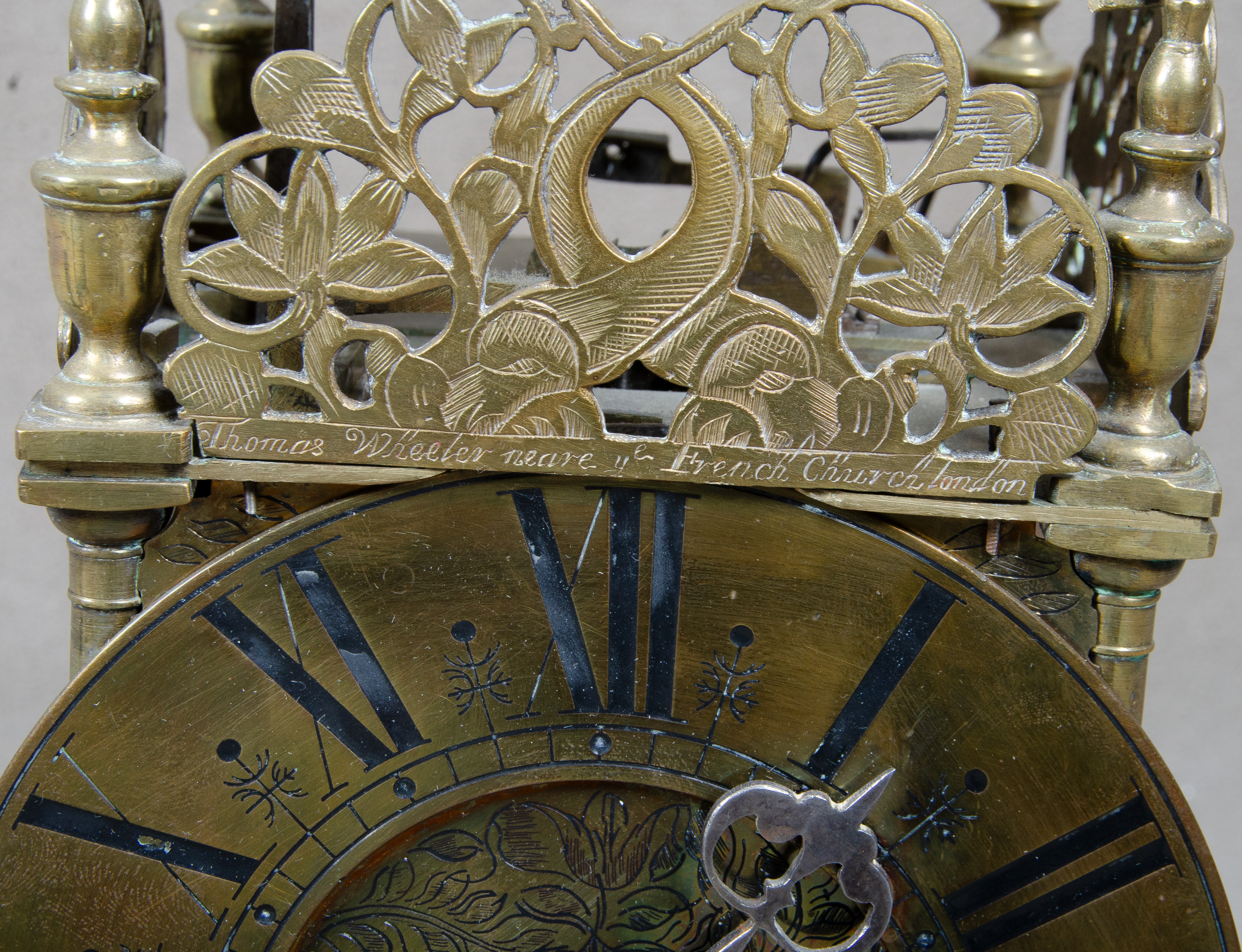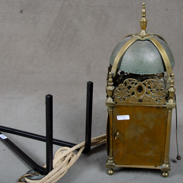 - Katalog-Nr: 529Laternenuhr. London, Thomas Wheeler 17. Jh. Bronze, mit gusseiserner Glocke und Messingzifferblatt, oberhalb beschriftet: „Thomas Wheeler neare ye French Church London“, H=38,5 cm, B=14 cm, T=14,5 cm. (Funktion ungeprüft)o.L.