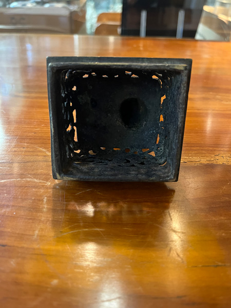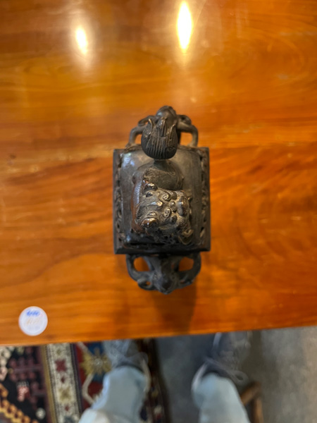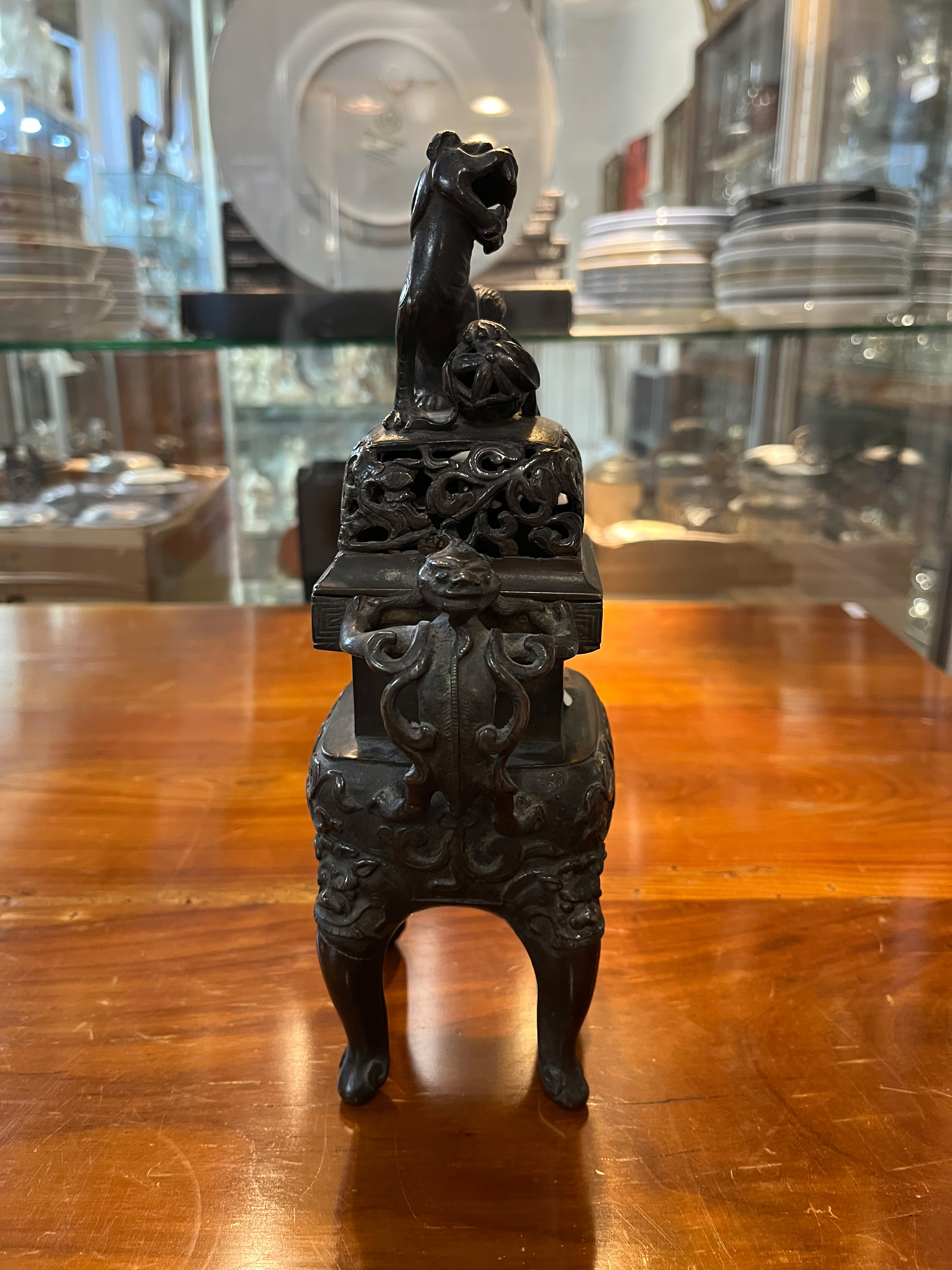 - Katalog-Nr: 536Räucherdeckelgefäß. Asien. Bronze, reliefiert, teilw. durchbrochen, H=26 cm. (ein Fuß geklebt)o.L.