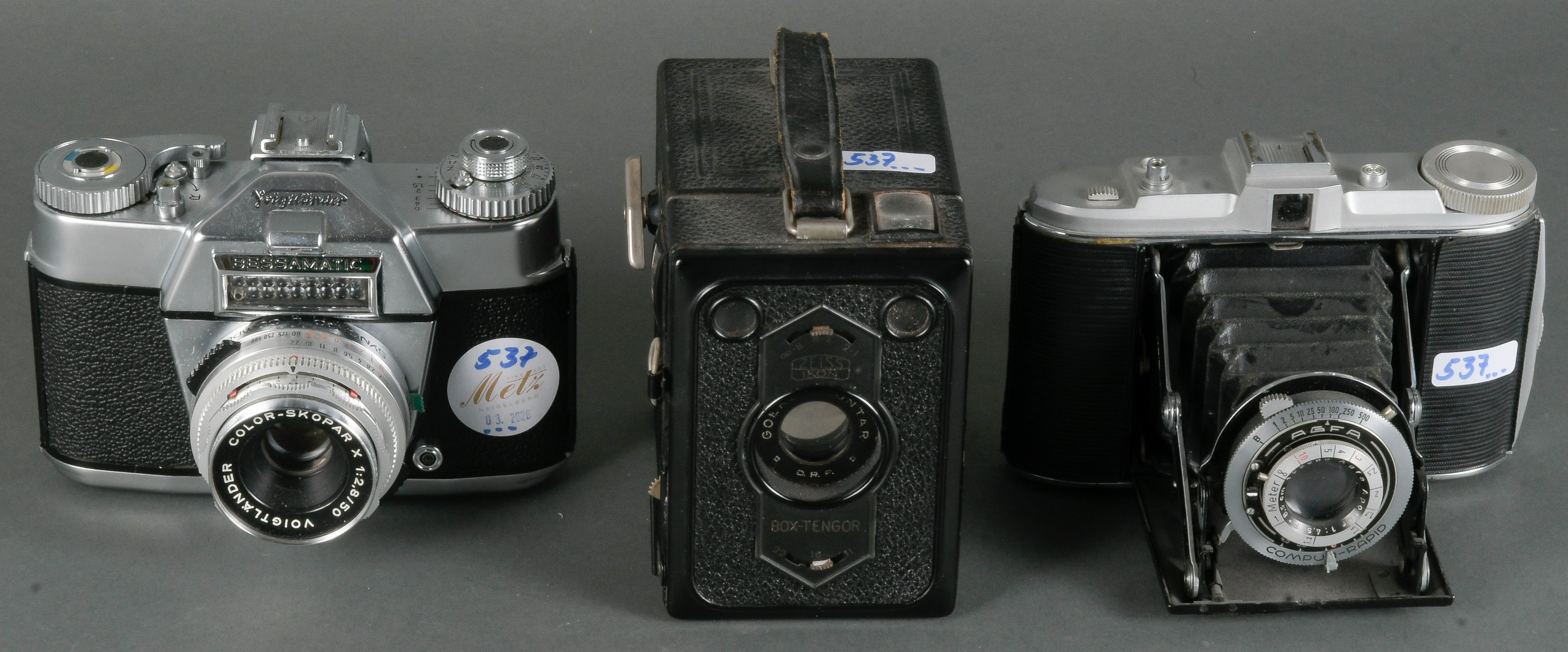 - Katalog-Nr: 537Drei Fotoapparate: Zeiss „Box Tengor 54/2“, Voigtländer „Bessamatic“ und Agfa „Compur-Rapid“. (Funktion ungeprüft)o.L.