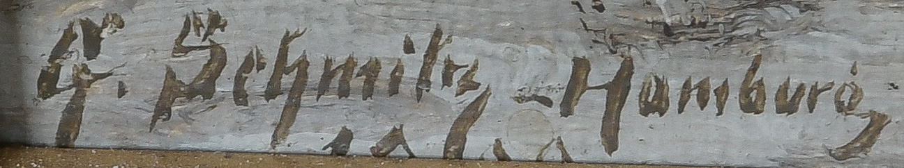 - Katalog-Nr: 540Georg Schmitz (1851-1917). Winterlandschaft mit Personenstaffage und Gebäude. Öl/Lw., li./u./sign./bez. „Hamburg“, gerahmt, 24,5 x 32,5 cm.o.L.