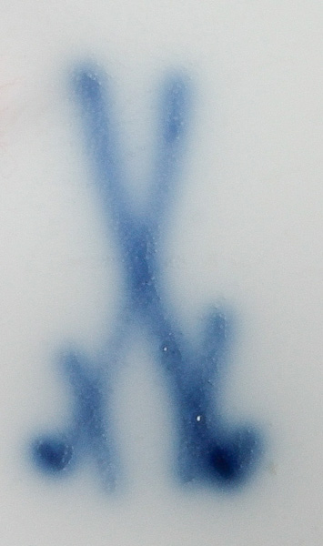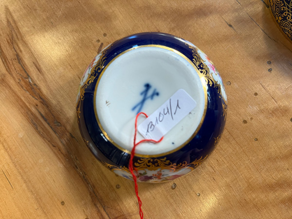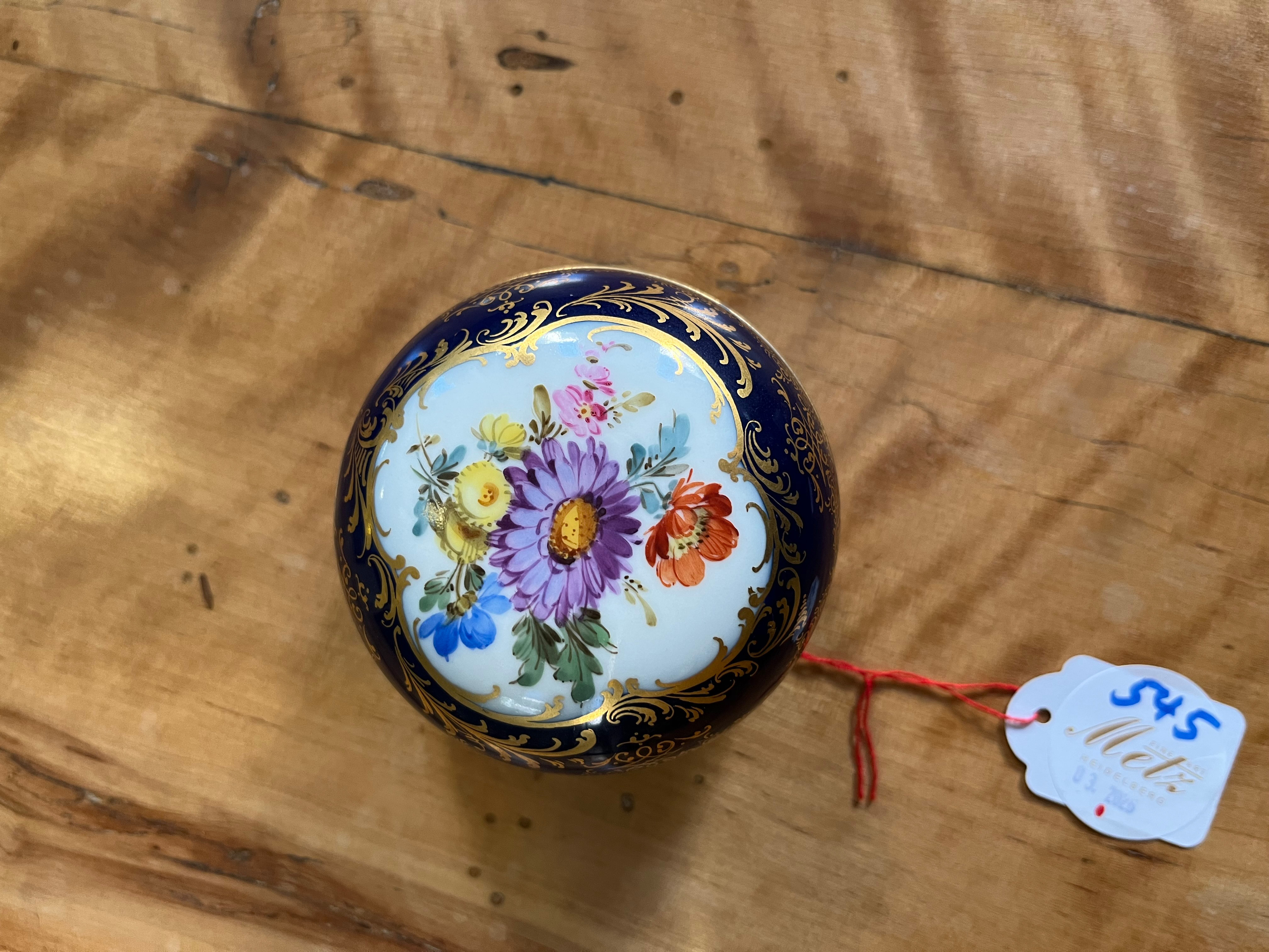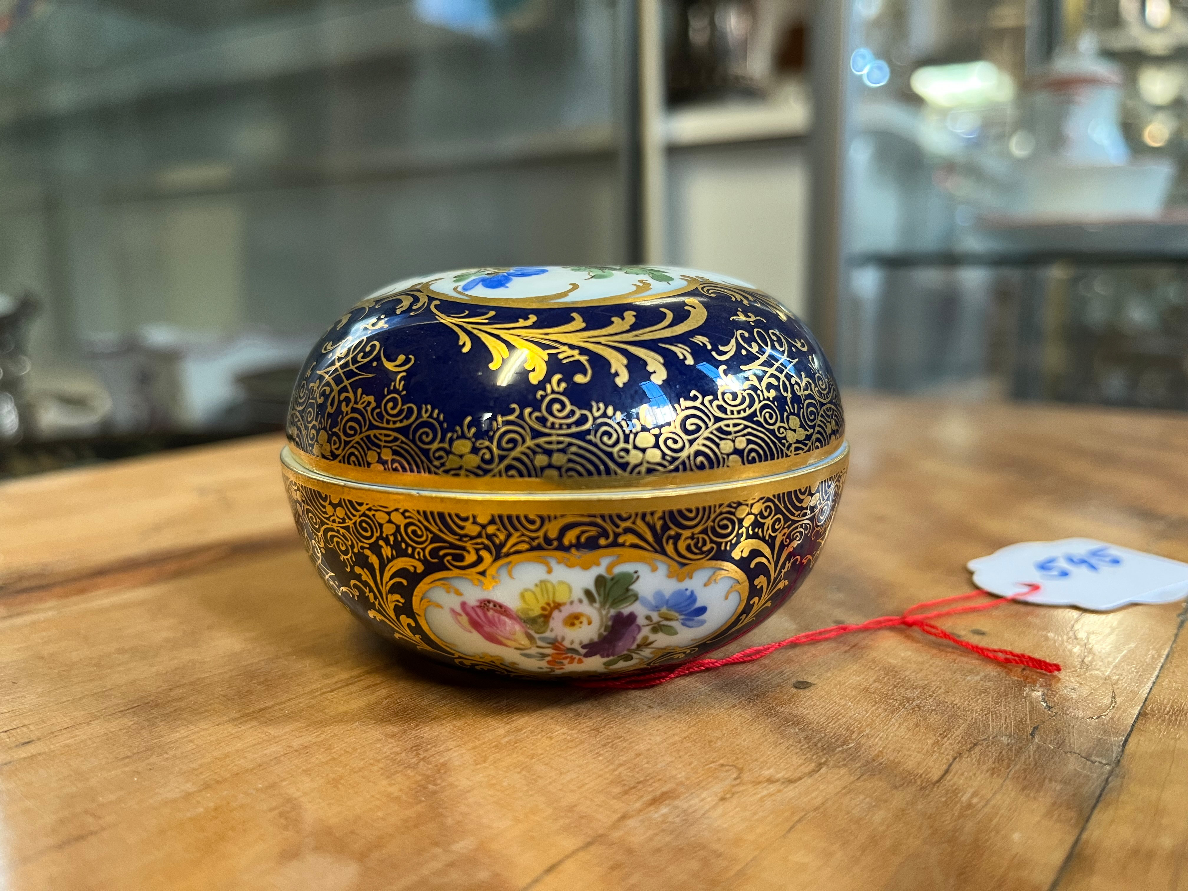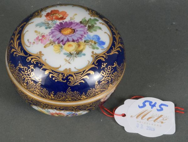 - Katalog-Nr: 545Runde Deckeldose. Meissen 19. Jh. Kobaltblauer Fond mit Goldspitzenbordüre und -kartusche. Reserve bunt bemalt mit Floraldekor. Porzellan, am Boden unterglasurblaue Schwertermarke, H=5,1 cm, D=7,5 cm.o.L.