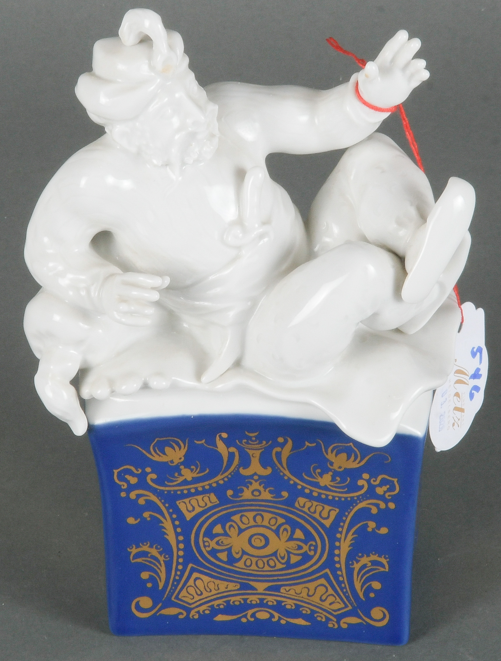 - Katalog-Nr: 546Schehereban aus der Serie „1001 Nacht“. Meissen 1981. Sitzend auf rechteckigem, erhöhtem Sockel. Porzellan, weiß glasiert, am Boden unterglasurblaue Schwertermarke. Entwurf von Peter Strang, H=18 cm.o.L.