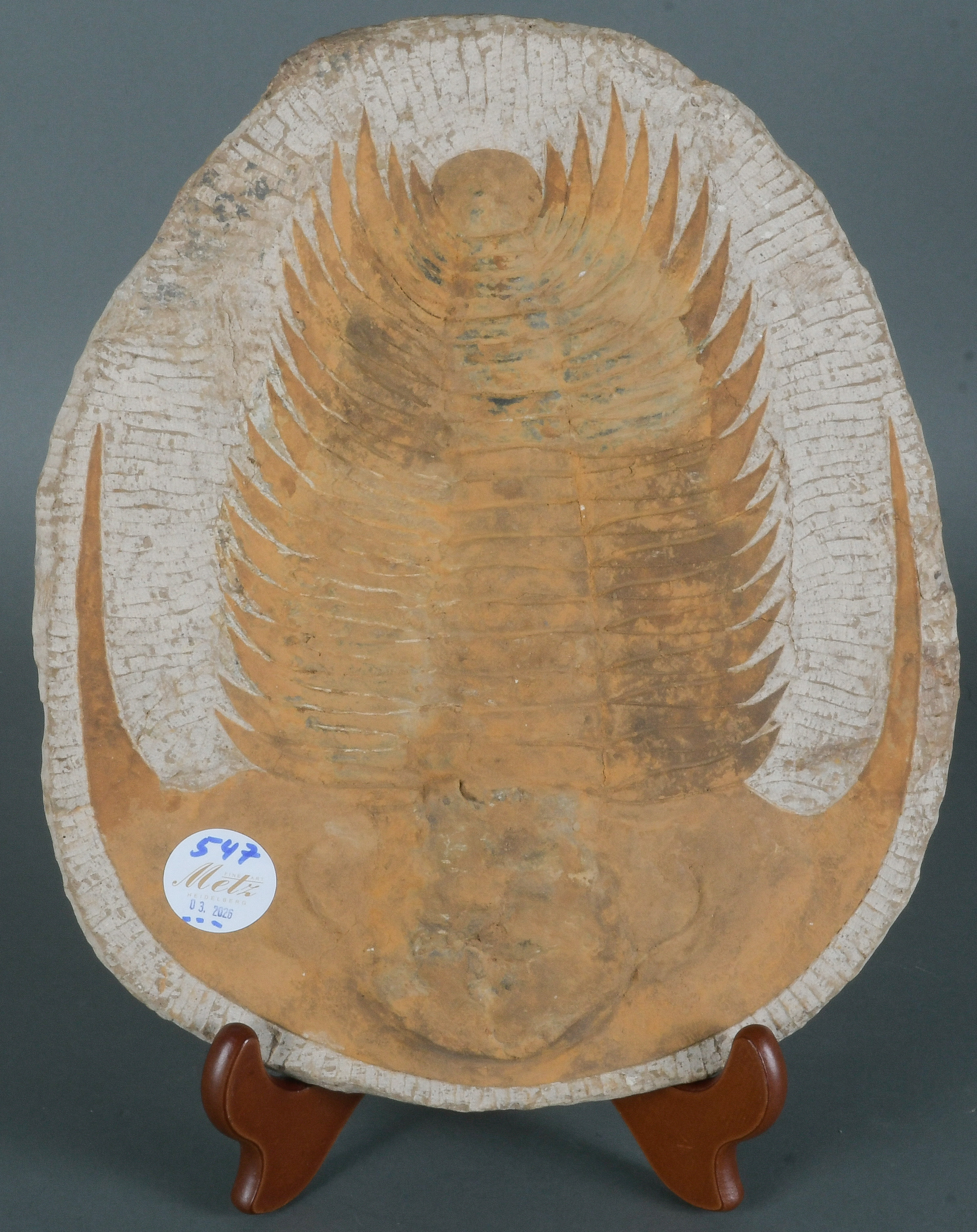 - Katalog-Nr: 547Sehr großes Exemplar eines Trilobiten Paradoxides. Fundort Marokko, wohl Mittelkambrium / Karbonzeit, somit eines der ältesten größeren Lebewesen, 31 x 25 cm.o.L.