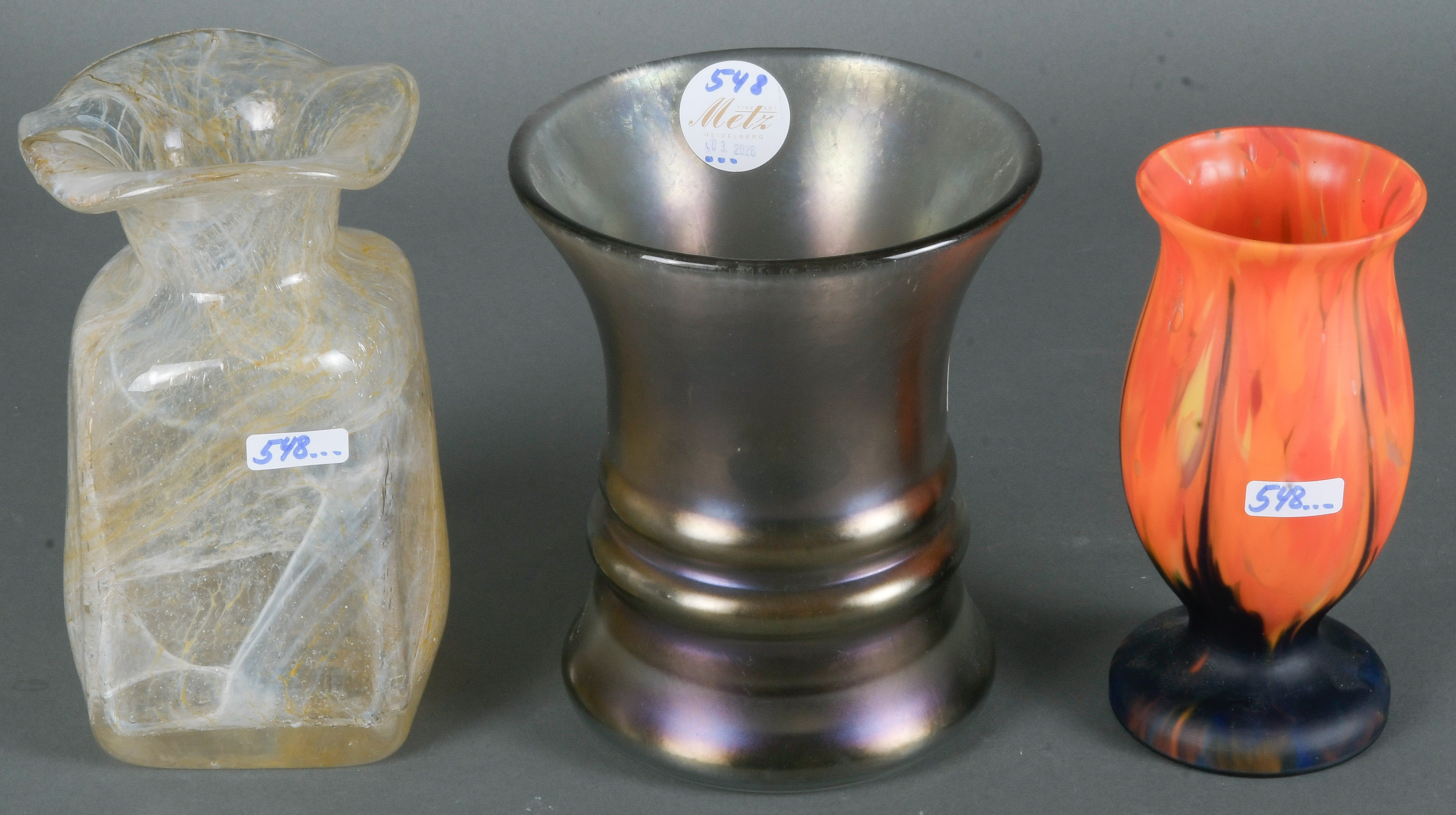 - Katalog-Nr: 548Drei unterschiedliche Vasen. Deutsch 20. Jh. Farbloses Glas, teilw. farbig überfangen, H=16,5 bis 18 cm.o.L.