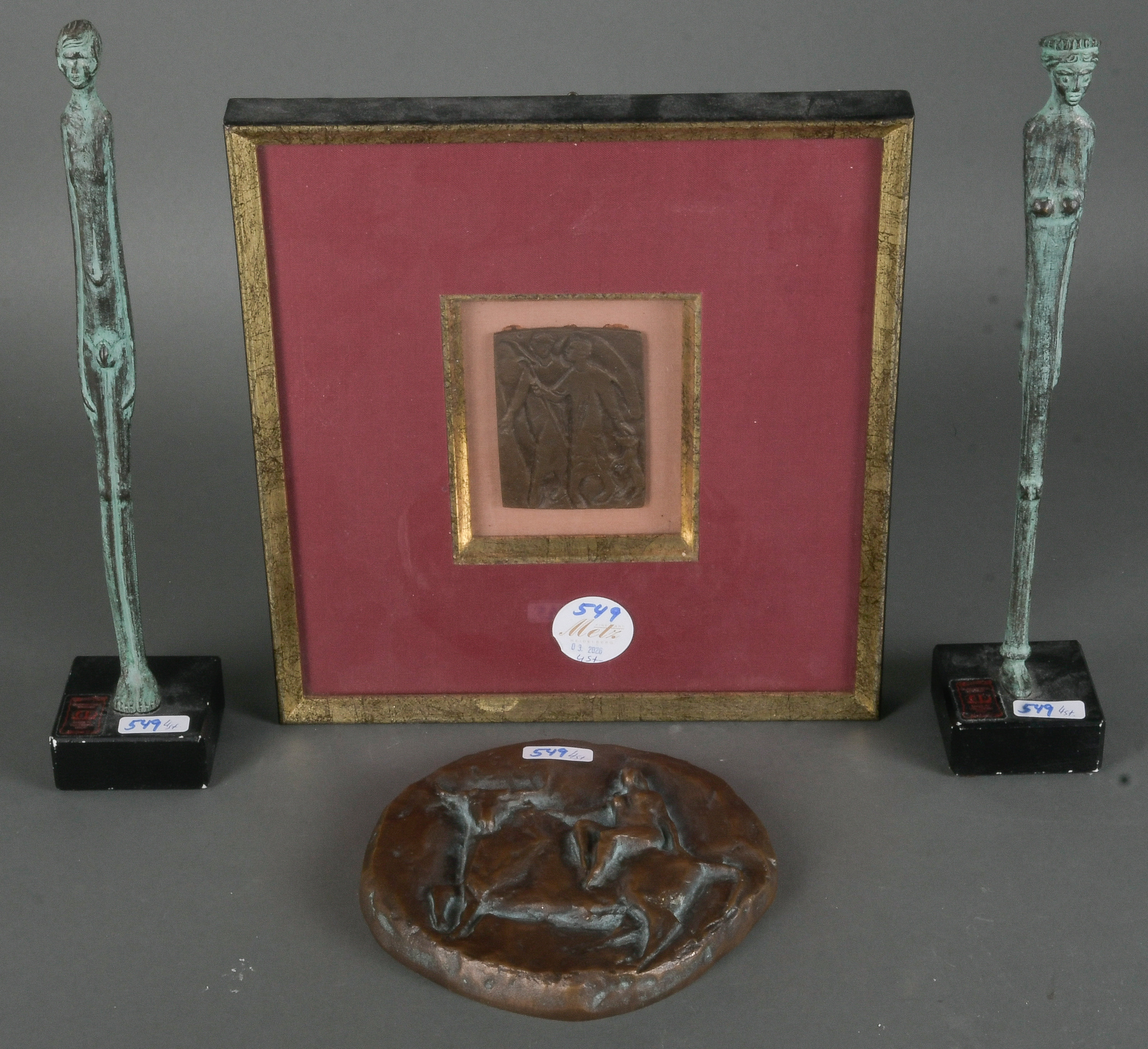 - Katalog-Nr: 549Viertlgs. Konvolut Bronze: Heide Dobberkau (1929-2021) attrib., Reliefplakette „Entführung der Europa“, verso nummeriert „3179“ (D=14,8 cm); Plakette mit zwei Männern und Hund, hi./Gl. gerahmt (7,5 x 5 cm) sowie zwei Museumsrepliken nach etruskischen Figuren, H=28 / 29 cm.o.L.